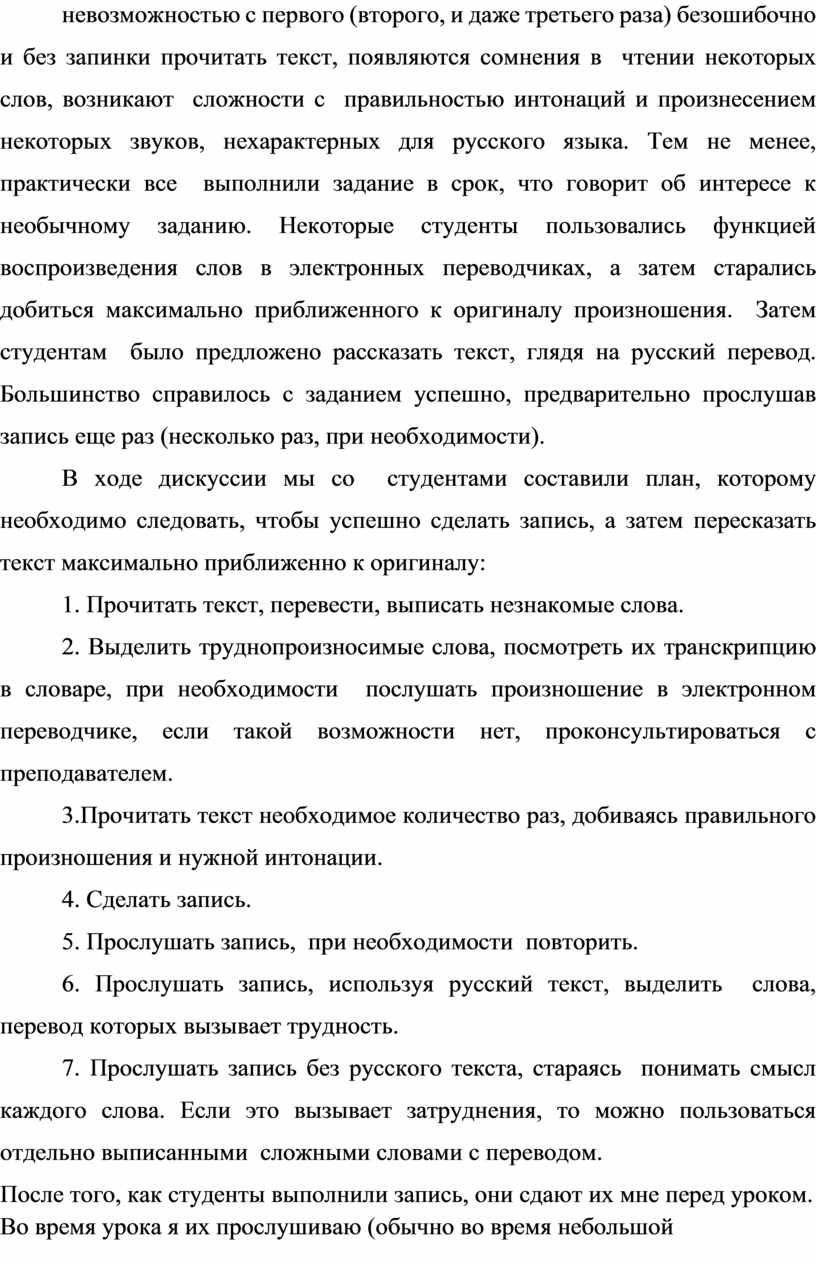 Студенты, первый раз получившие задание записать предложенный текст на диктофон, были уверены в легкости его выполнения. Однако в процессе работы учащиеся столкнулись с рядом трудностей: невозможностью с первого (второго, и даже третьего раза) безошибочно и без запинки прочитать текст, появляются сомнения в чтении некоторых слов, возникают сложности с правильностью интонаций и произнесением некоторых звуков, нехарактерных для русского языка. Тем не менее, практически все выполнили задание в срок, что говорит об интересе к необычному заданию. Некоторые студенты пользовались функцией воспроизведения слов в электронных переводчиках, а затем старались добиться максимально приближенного к оригиналу произношения. Затем студентам было предложено рассказать текст, глядя на русский перевод. Большинство справилось с заданием успешно, предварительно прослушав запись еще раз (несколько раз, при необходимости).