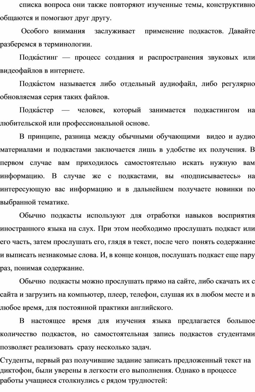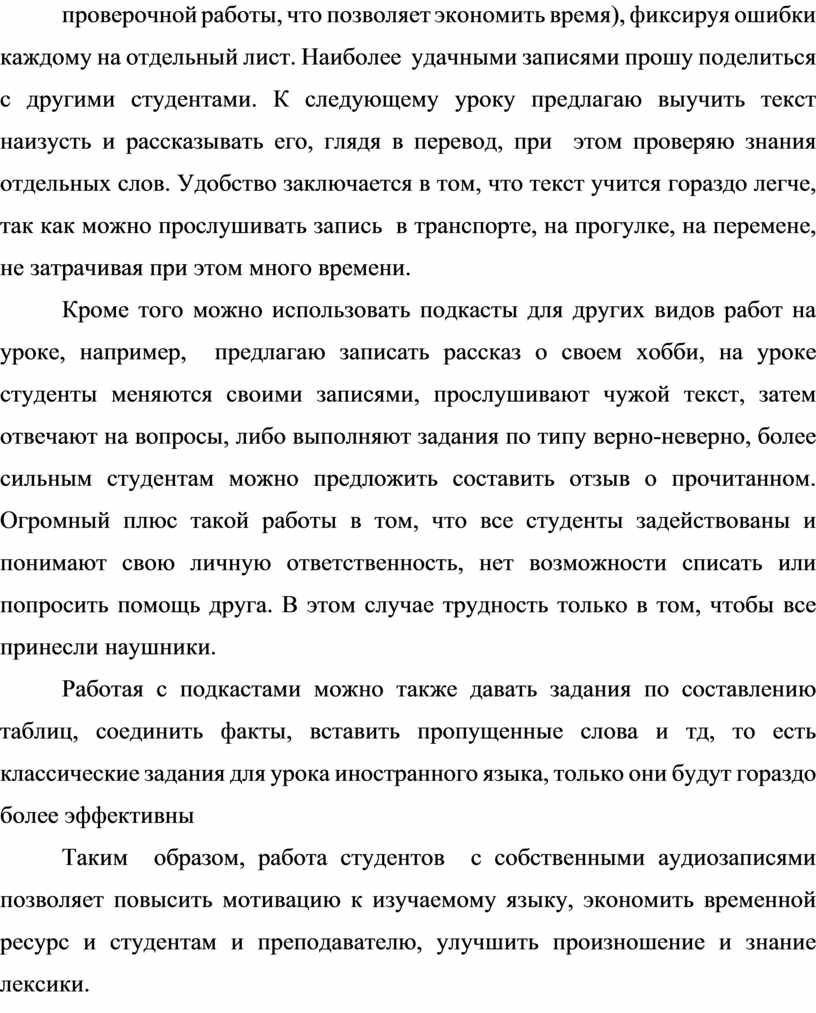 В настоящее время для изучения языка предлагается большое количество подкастов, но самостоятельная запись подкастов студентами позволяет реализовать сразу несколько задач.