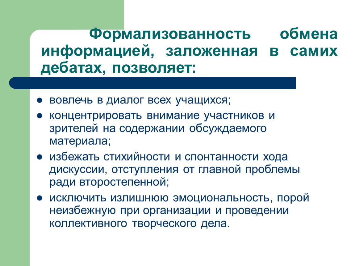 Формализованность обмена информацией, заложенная в самих дебатах, позволяет: