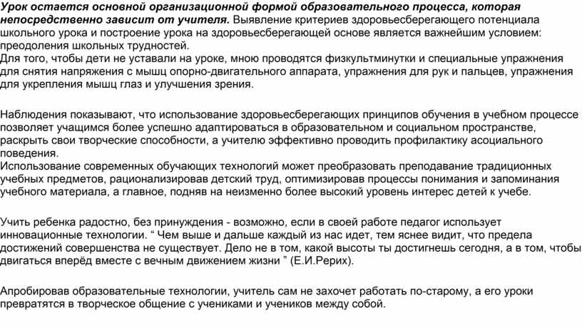 здоровьесберегающего потенциала школьного урока и построение урока на