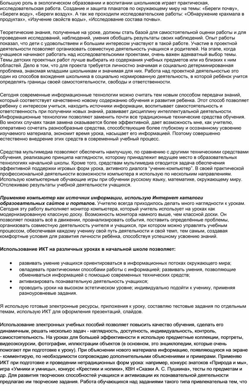 Использование электронных учебных пособий позволяет повысить качество обучения, сделать его динамичным, решать несколько задач - наглядность, доступность, индивидуальность, контроль, самостоятельность. На уроках для большей эффективности я использую предметные коллекции, портреты, видеоэкскурсии, фотографии, иллюстрации объектов (в основном, это энциклопедии, которые очень помогают при подготовке к уроку). При объяснении нового материала информацию, появляющуюся на экране - комментирую, по необходимости сопровождаю дополнительными объяснениями и примерами. Применяю ИКТ при подготовке и проведении нетрадиционных форм урока: например, конкурс знатоков «Природа и мы», игра «Умники и умницы», конкурс «Крестики и нолики», КВН «Сказки А. С. Пушкина», тесты по предметам и др. Для развития творческих способностей учащихся и активизации их познавательной деятельности предлагаю им творческие задания. Работа обучающихся над заданиями такого типа привлекательна тем, что проявляется личностная ориентация педагогического процесса, происходит поиск и развитие способностей, заложенных природой в каждом ребенке.