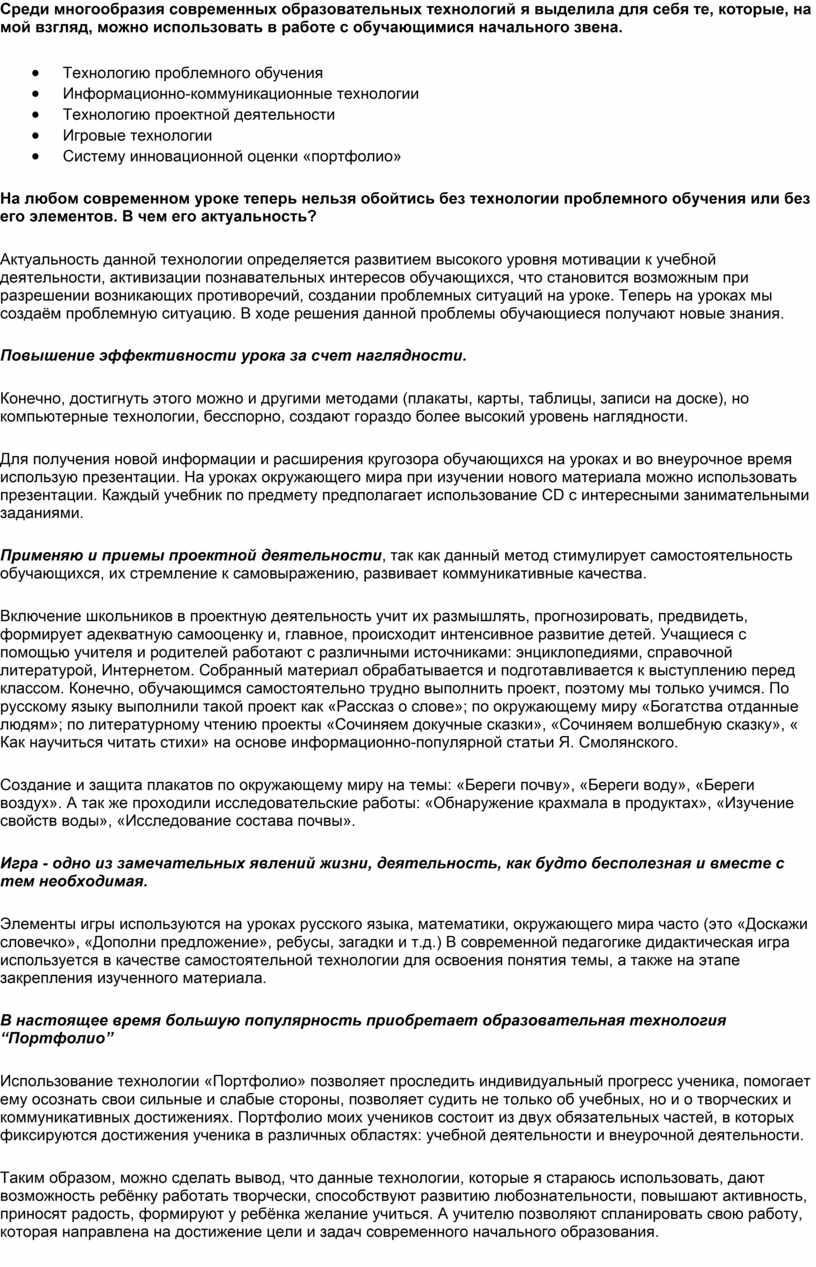 Среди многообразия современных образовательных технологий я выделила для себя те, которые, на мой взгляд, можно использовать в работе с обучающимися начального звена.