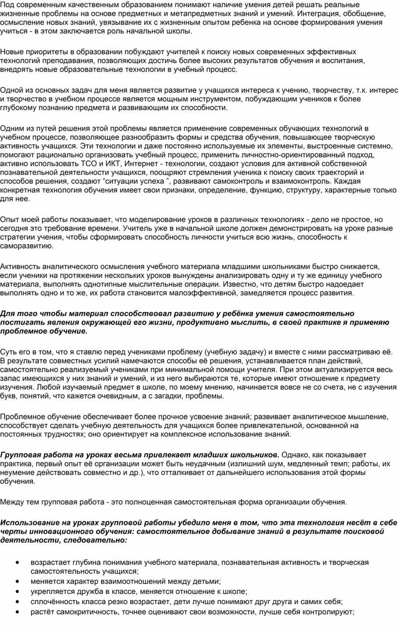 Под современным качественным образованием понимают наличие умения детей решать реальные жизненные проблемы на основе предметных и метапредметных знаний и умений. Интеграция, обобщение, осмысление новых знаний, увязывание их с жизненным опытом ребенка на основе формирования умения учиться - в этом заключается роль начальной школы.