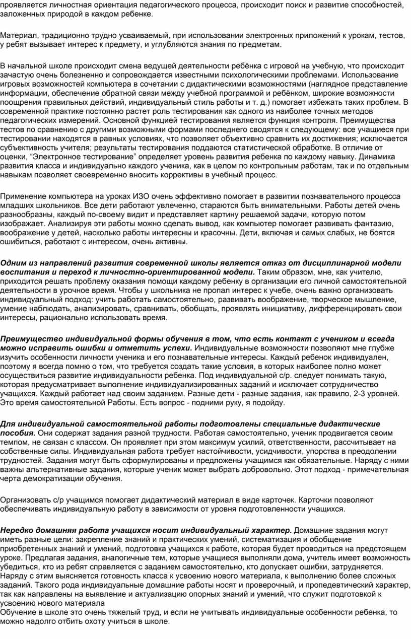Преимущество индивидуальной формы обучения в том, что есть контакт с учеником и всегда можно исправить ошибки и отметить успехи. Индивидуальные возможности позволяют мне глубже изучить особенности личности ученика и его познавательные интересы. Каждый ребенок индивидуален, поэтому я всегда помню о том, что требуется создать такие условия, в которых наиболее полно может осуществиться развитие индивидуальности ребенка. Под индивидуальной с/р. следует понимать такую, которая предусматривает выполнение индивидуализированных заданий и исключает сотрудничество учащихся. Каждый работает над своим заданием. Разные дети - разные задания, как правило, 2-3 уровней. Это время самостоятельной Работы. Есть вопрос - подними руку, я подойду.
