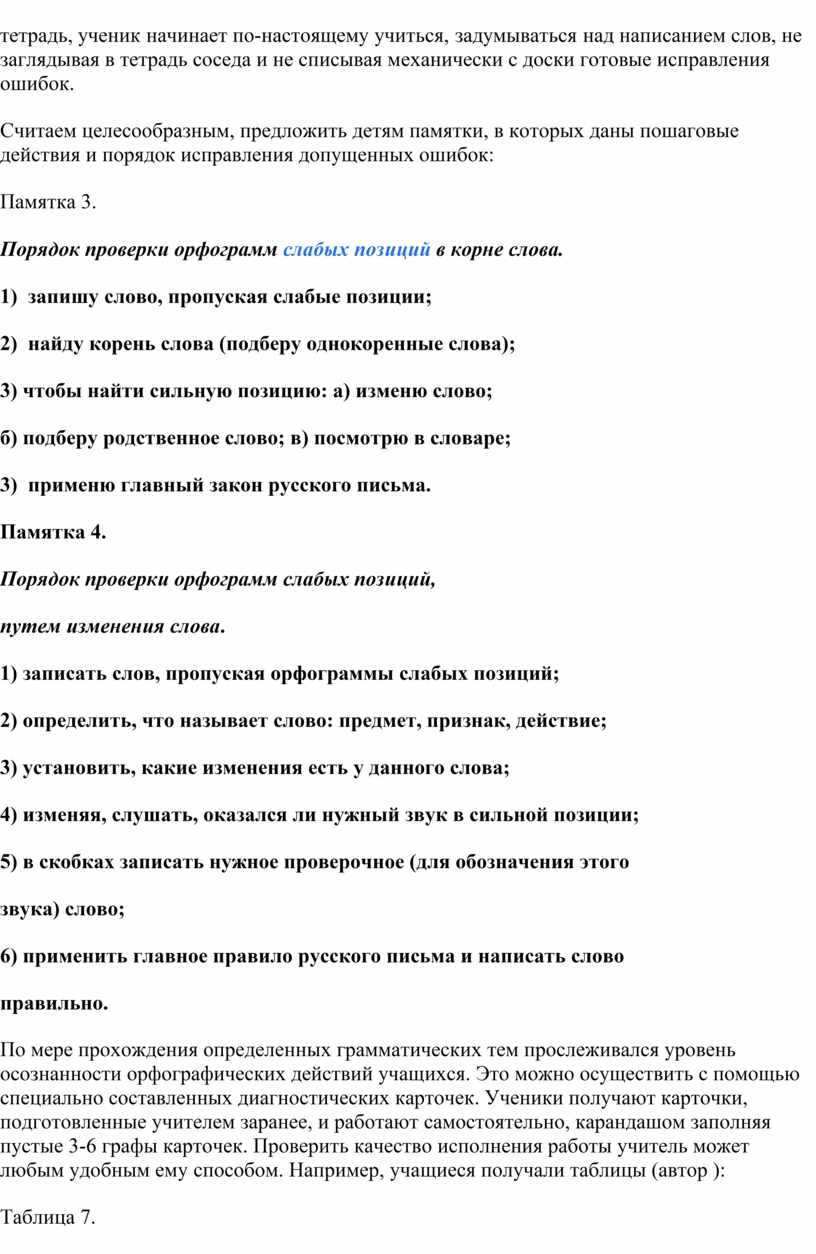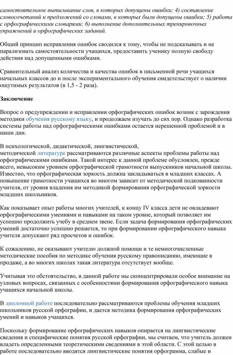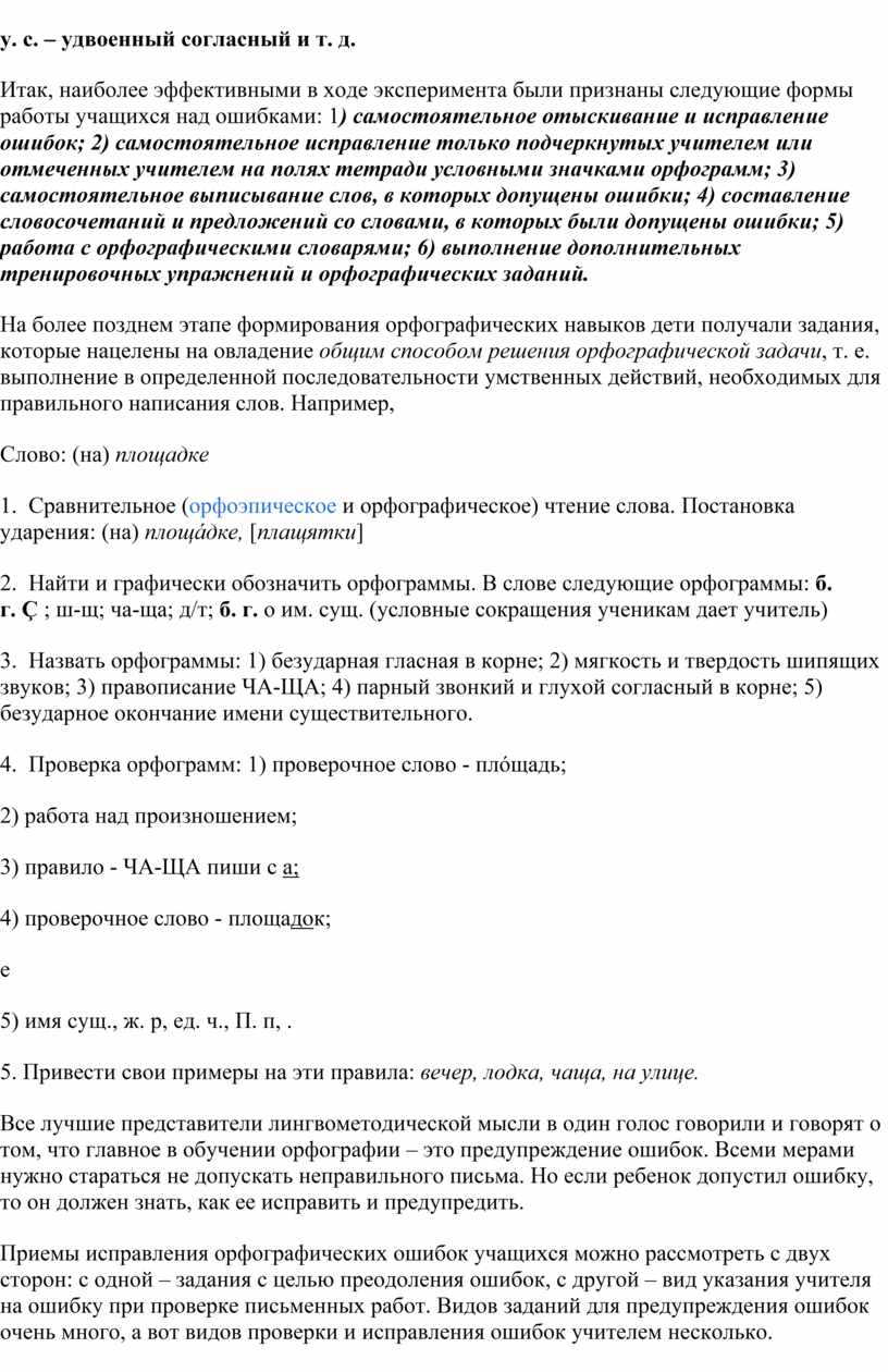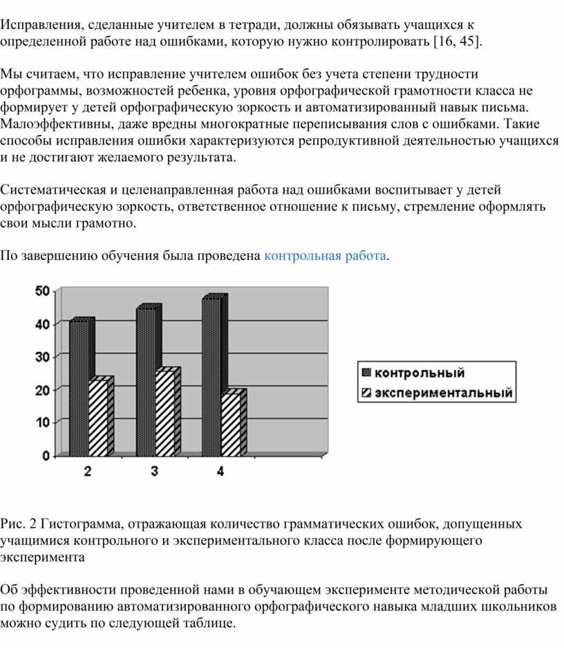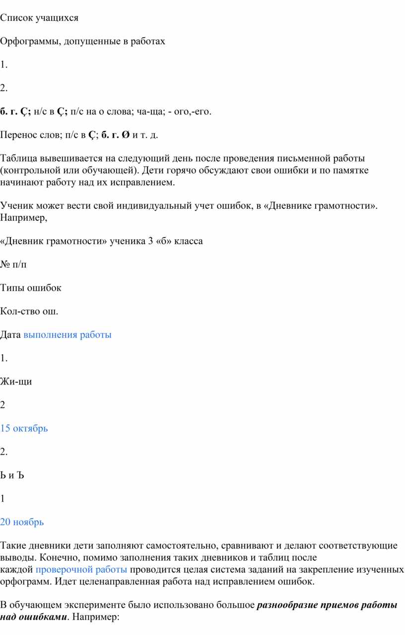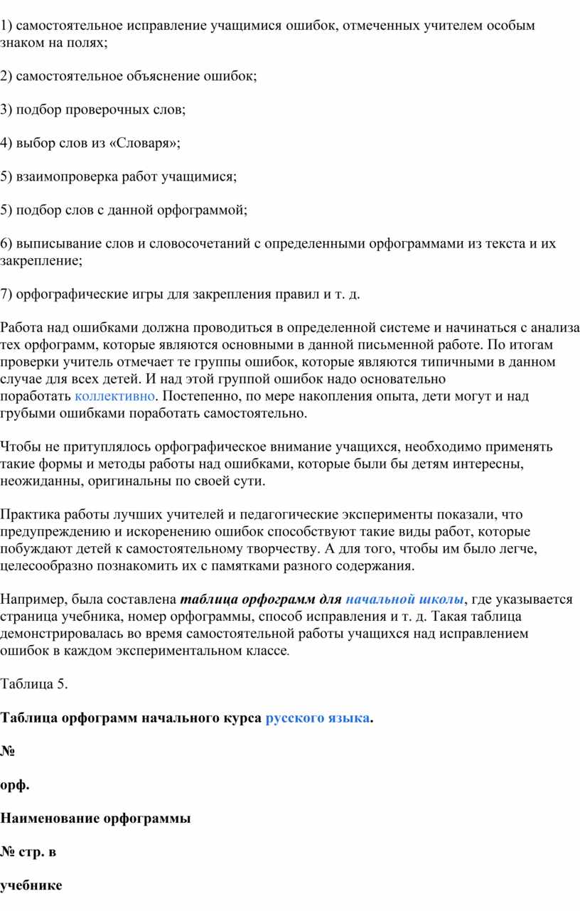 Итак, наиболее эффективными в ходе эксперимента были признаны следующие формы работы учащихся над ошибками: 1) самостоятельное отыскивание и исправление ошибок; 2) самостоятельное исправление только подчеркнутых учителем или отмеченных учителем на полях тетради условными значками орфограмм; 3) самостоятельное выписывание слов, в которых допущены ошибки; 4) составление словосочетаний и предложений со словами, в которых были допущены ошибки; 5) работа с орфографическими словарями; 6) выполнение дополнительных тренировочных упражнений и орфографических заданий.