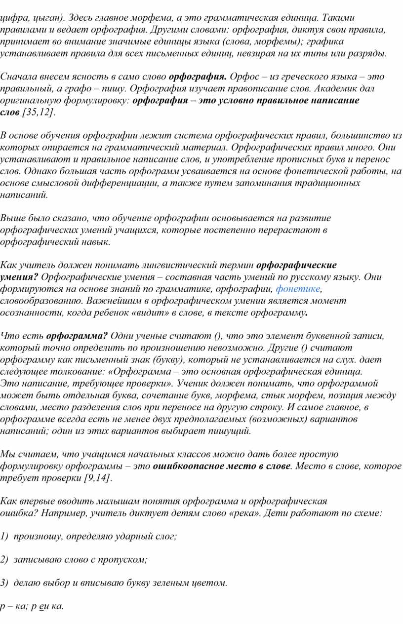 Поскольку формирование орфографических навыков опирается на лингвистические сведения и специфические понятия русской орфографии, мы считаем, что учитель должен владеть определенными теоретическими сведениями в этой области. Что должен знать учитель о лингвистическом термине орфография? Во-первых, что орфография – это система правил, регулирующих написание отдельных слов и их значимых частей, правил о слитных, полуслитных и раздельных написаниях, об употреблении прописных и заглавных букв и правилах переноса [33,6].