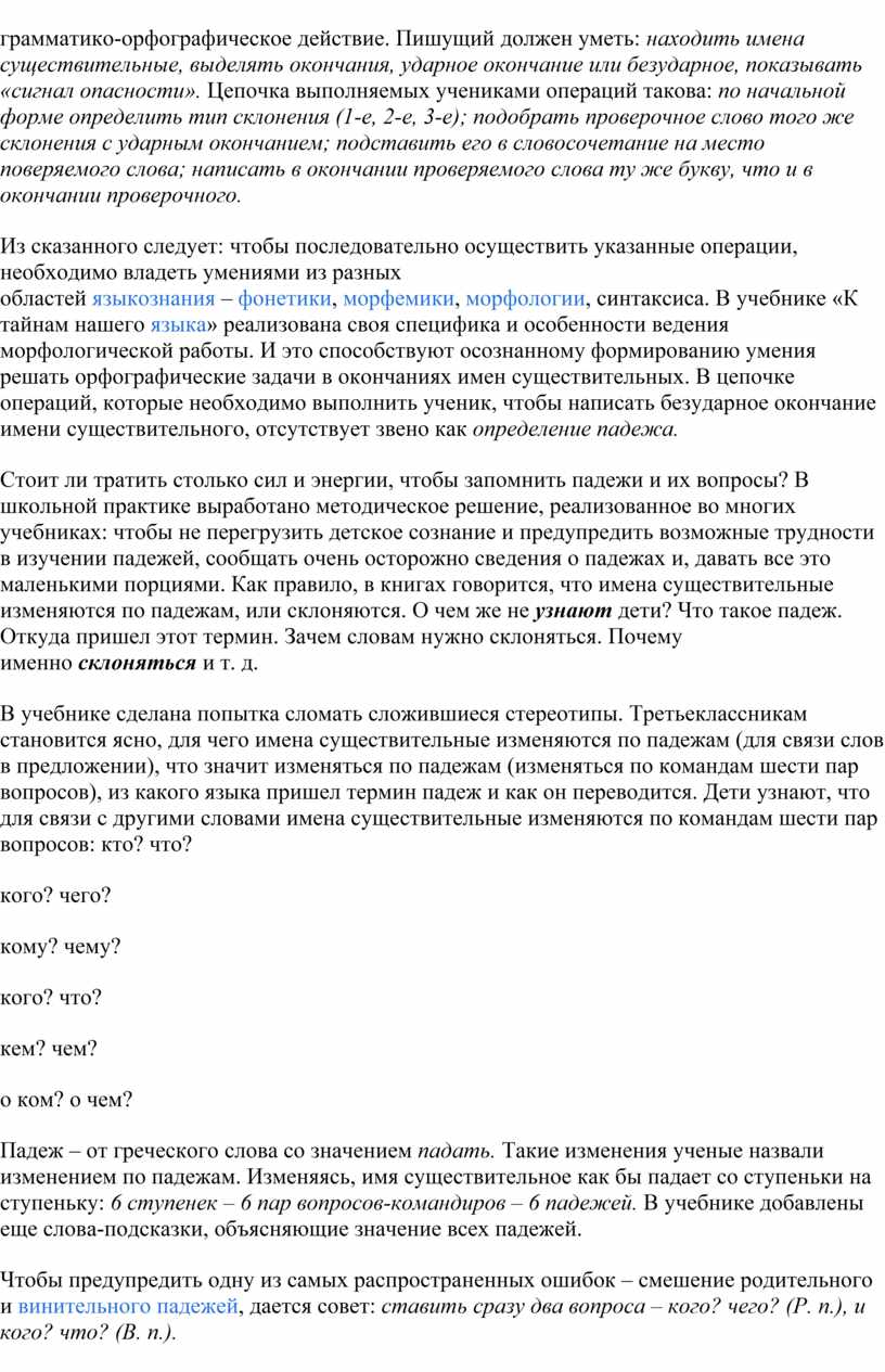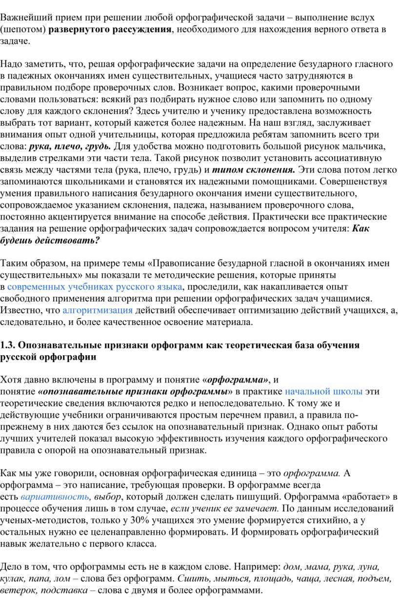 Поскольку формирование орфографических навыков опирается на лингвистические сведения и специфические понятия русской орфографии, мы считаем, что учитель должен владеть определенными теоретическими сведениями в этой области. С этой целью в работе последовательно вводятся лингвистические понятия орфограмма, слабые и сильные позиции звуков, орфографическое действие, орфографическая задача, орфографические умения, орфографический навык и т. д.