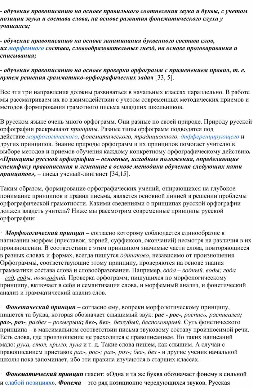 Методика обучения правописанию в начальной школе должна опираться не только на правила, но и на всю систему языкового развития: на усвоение звукового строя русского языка и его графики; на процесс овладения чтением, письмом, аудированием; на развитие дикции и орфоэпического навыка; на знание состава слова, законов словообразования и словоизменения и многое другое.