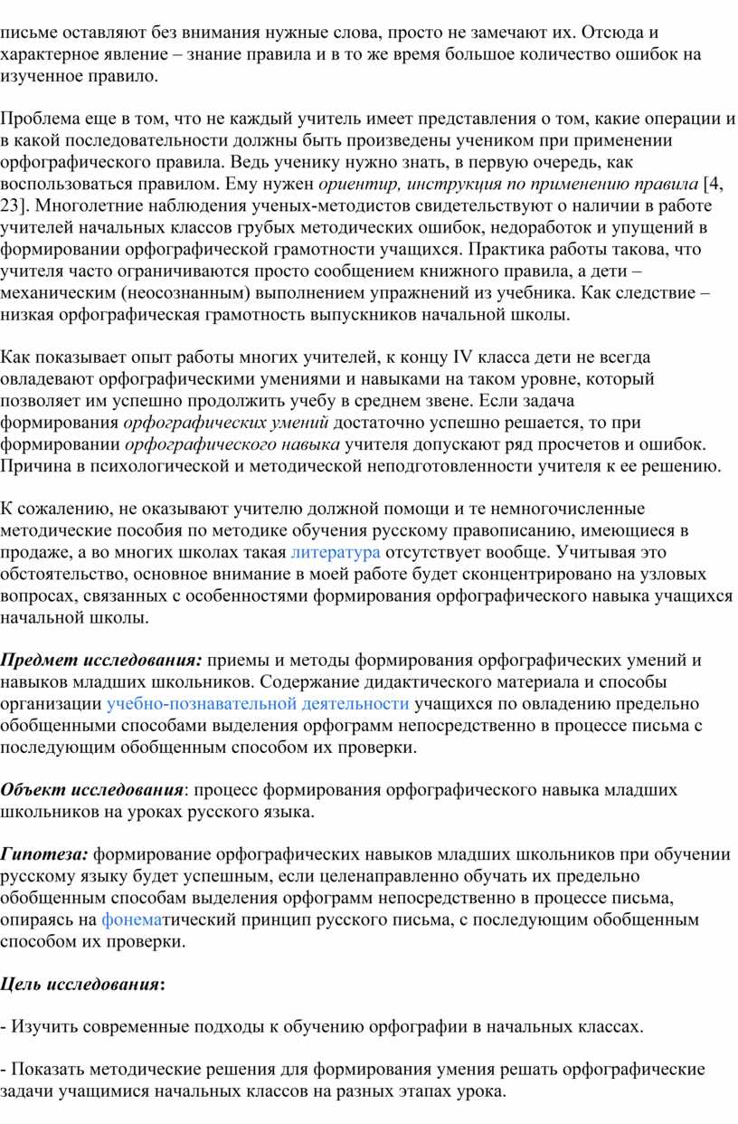 Предмет исследования: приемы и методы формирования орфографических умений и навыков младших школьников. Содержание дидактического материала и способы организации учебно-познавательной деятельности учащихся по овладению предельно обобщенными способами выделения орфограмм непосредственно в процессе письма с последующим обобщенным способом их проверки.