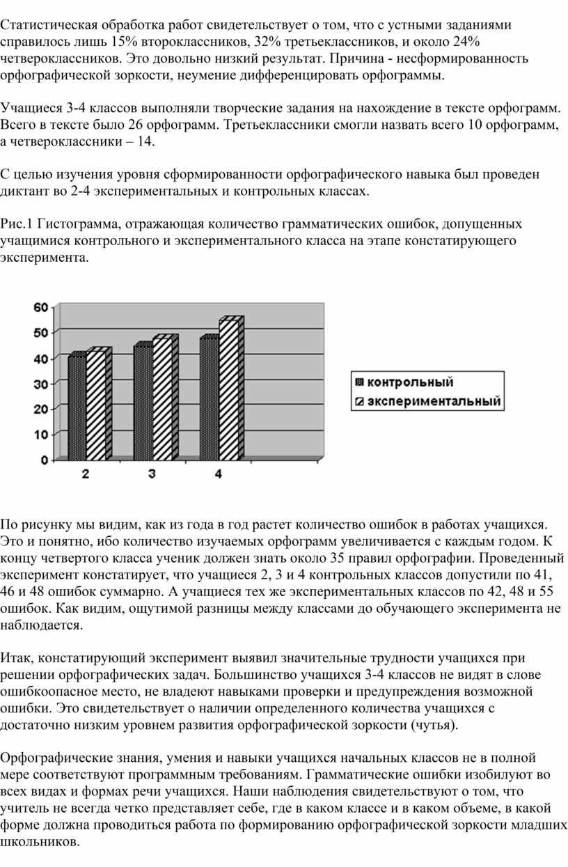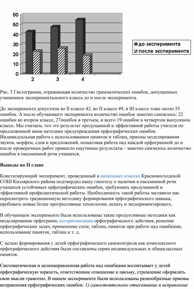 Констатирующий эксперимент, проведенный в начальных классах Красновосходской СОШ Кизлярского района подтвердил нашу гипотезу о наличии в письменной речи учащихся устойчивых орфографических ошибок, требующих продуманной и эффективной профилактической работы. Необходимость такой работы заставило нас пересмотреть традиционную методику формирования орфографического навыка, пробовать новые более прогрессивные технологии, искать и экспериментировать.