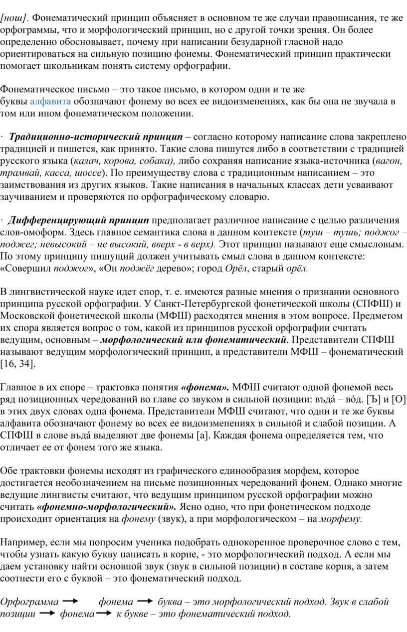 В лингвистической науке идет спор, т. е. имеются разные мнения о признании основного принципа русской орфографии. У Санкт-Петербургской фонетической школы (СПФШ) и Московской фонетической школы (МФШ) расходятся мнения в этом вопросе. Предметом их спора является вопрос о том, какой из принципов русской орфографии считать ведущим, основным – морфологический или фонематический. Представители СПФШ называют ведущим морфологический принцип, а представители МФШ – фонематический [16, 34].