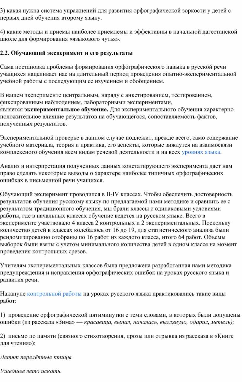 В обучающем эксперименте были использованы такие продуктивные методики как моделирование орфограмм, алгоритмизация орфографического действия, решение орфографических задач, применение схем, таблиц, памяток при работе над ошибками, использование памяток, таблиц и т. д.