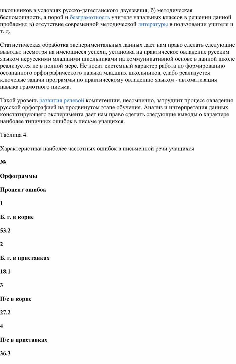 Сравнительный анализ количества и качества ошибок в письменной речи учащихся начальных классов до и после экспериментального обучения свидетельствует о наличии ощутимых результатов (в 1,5 - 2 раза).