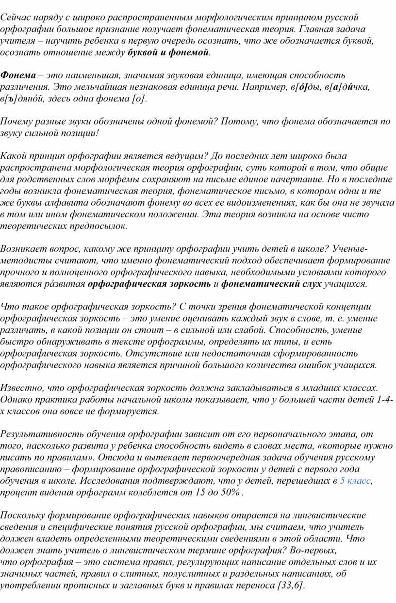 Возникает вопрос, какому же принципу орфографии учить детей в школе? Ученые-методисты считают, что именно фонематический подход обеспечивает формирование прочного и полноценного орфографического навыка, необходимыми условиями которого являются рáзвитая орфографическая зоркость и фонематический слух учащихся.