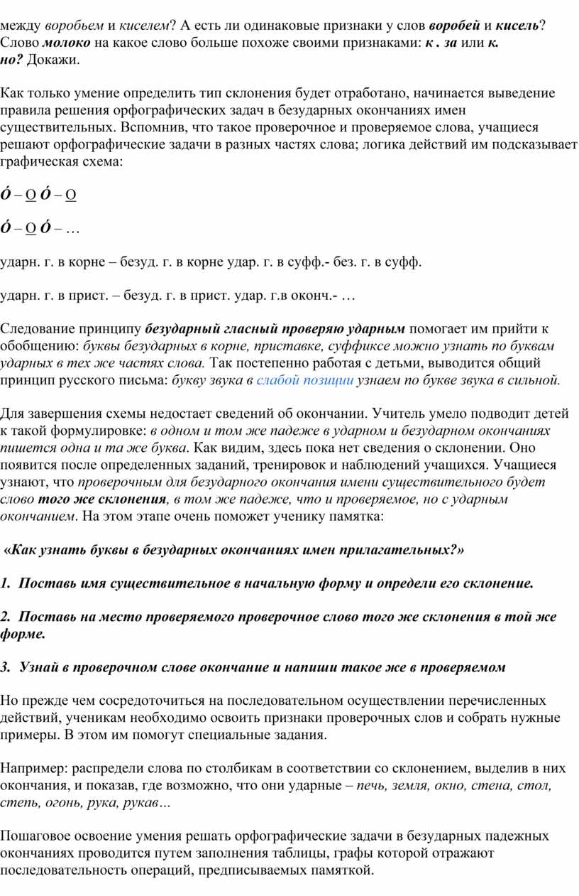 Проблема еще в том, что не каждый учитель имеет представления о том, какие операции и в какой последовательности должны быть произведены учеником при применении орфографического правила. Ведь ученику нужно знать, в первую очередь, как воспользоваться правилом. Ему нужен ориентир, инструкция по применению правила [4, 23]. Многолетние наблюдения ученых-методистов свидетельствуют о наличии в работе учителей начальных классов грубых методических ошибок, недоработок и упущений в формировании орфографической грамотности учащихся. Практика работы такова, что учителя часто ограничиваются просто сообщением книжного правила, а дети – механическим (неосознанным) выполнением упражнений из учебника. Как следствие – низкая орфографическая грамотность выпускников начальной школы.
