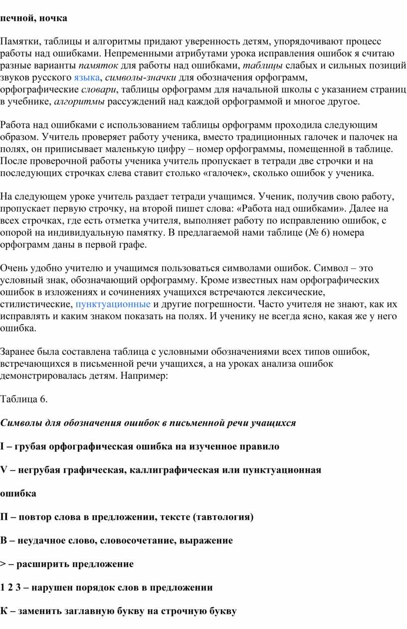 К сожалению, большинство учителей предпочитают традиционный прием указания ошибки: зачеркивание орфографической ошибки, надписывание нужной буквы, обозначение на полях условным знаком. При такой проверке не учитываются тип ошибки, ее причины, индивидуальные особенности учащихся, цель исправления ошибки, уровень овладения умением исправлять орфографические ошибки. Чем старше ученик, тем больше должна быть доля самостоятельности в работе над ошибками. Использование одного и того же приема исправления ошибок учителем приводит к тому, что учащиеся не любят работу над ошибками, делают это механически и повторно допускают одни и те же ошибки.