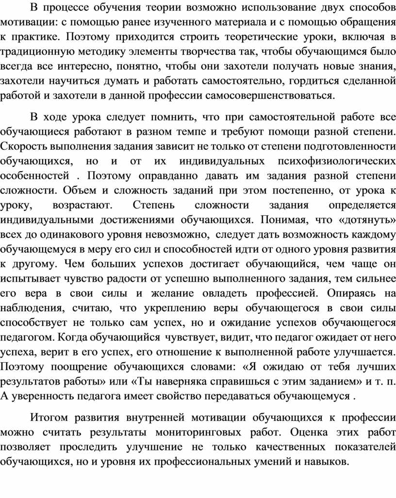 В процессе обучения теории возможно использование двух способов мотивации: с помощью ранее изученного материала и с помощью обращения к практике. Поэтому приходится строить теоретические уроки, включая в традиционную методику элементы творчества так, чтобы обучающимся было всегда все интересно, понятно, чтобы они захотели получать новые знания, захотели научиться думать и работать самостоятельно, гордиться сделанной работой и захотели в данной профессии самосовершенствоваться.