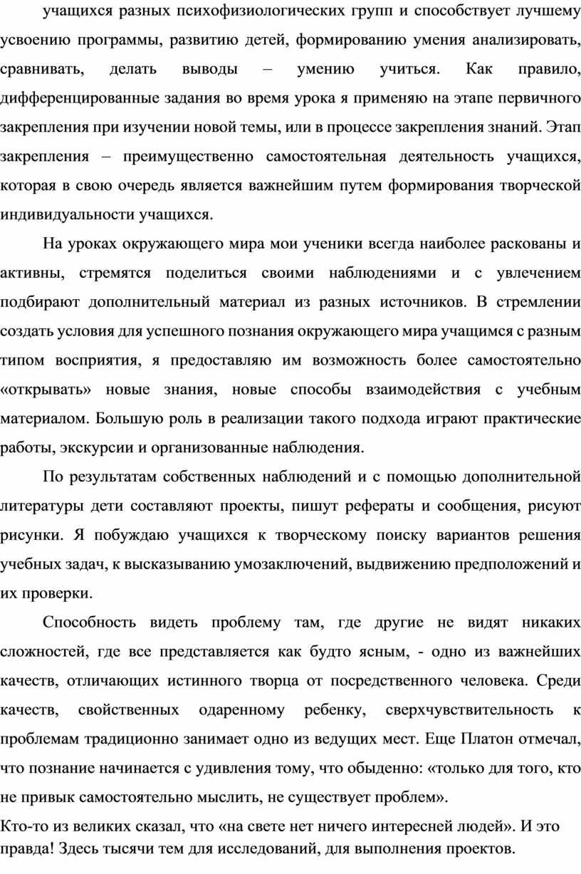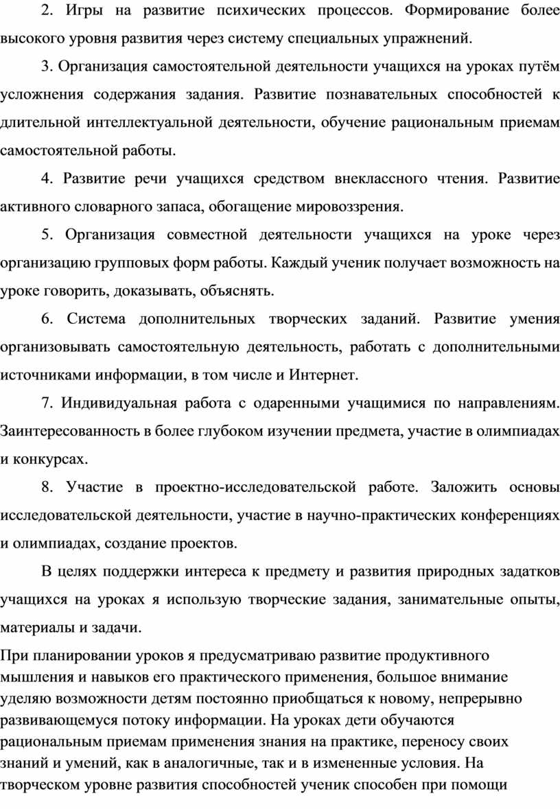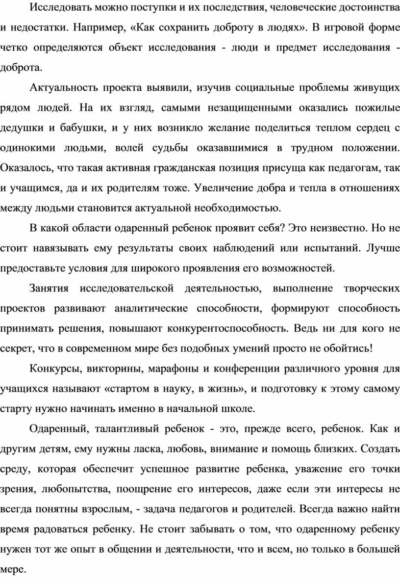 У одарённых детей чётко проявляется потребность в исследовательской и поисковой активности – это одно из условий, которое позволяет учащимся погрузиться в творческий процесс обучения и воспитывает в нём жажду знаний, стремление к открытиям, активному умственному труду, самопознанию. В учебном процессе развитие одарённого ребёнка следует рассматривать как развитие его внутреннего деятельностного потенциала, способности быть автором, творцом, активным созидателем своей жизни, уметь ставить цель, искать способы её достижения, быть способным к свободному выбору и ответственности за него, максимально использовать свои способности.