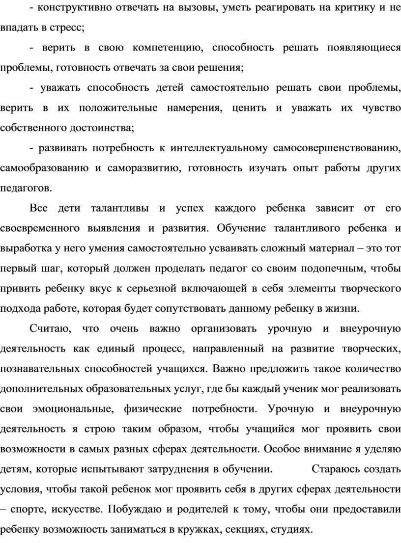 Считаю, что очень важно организовать урочную и внеурочную деятельность как единый процесс, направленный на развитие творческих, познавательных способностей учащихся. Важно предложить такое количество дополнительных образовательных услуг, где бы каждый ученик мог реализовать свои эмоциональные, физические потребности. Урочную и внеурочную деятельность я строю таким образом, чтобы учащийся мог проявить свои возможности в самых разных сферах деятельности. Особое внимание я уделяю детям, которые испытывают затруднения в обучении. Стараюсь создать условия, чтобы такой ребенок мог проявить себя в других сферах деятельности – спорте, искусстве. Побуждаю и родителей к тому, чтобы они предоставили ребенку возможность заниматься в кружках, секциях, студиях.