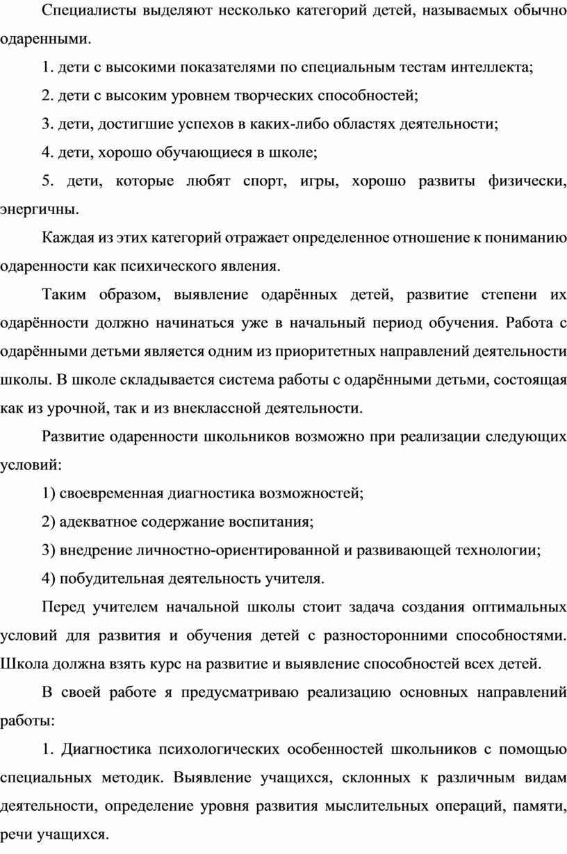 Перед учителем начальной школы стоит задача создания оптимальных условий для развития и обучения детей с разносторонними способностями. Школа должна взять курс на развитие и выявление способностей всех детей.
