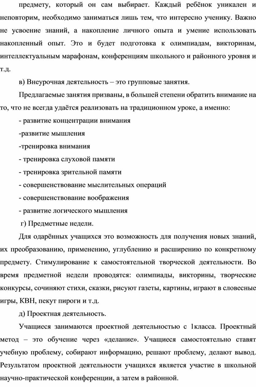 В работе с одарёнными учащимися важен личностно - ориентированный подход, максимальное раскрытие и развитие индивидуальности ученика по предмету, который он сам выбирает. Каждый ребёнок уникален и неповторим, необходимо заниматься лишь тем, что интересно ученику. Важно не усвоение знаний, а накопление личного опыта и умение использовать накопленный опыт. Это и будет подготовка к олимпиадам, викторинам, интеллектуальным марафонам, конференциям школьного и районного уровня и т.д.