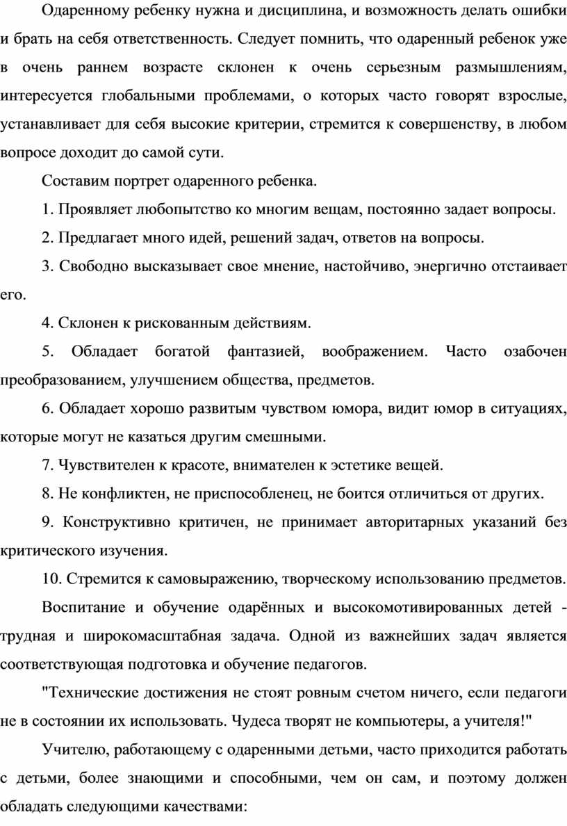Учителю, работающему с одаренными детьми, часто приходится работать с детьми, более знающими и способными, чем он сам, и поэтому должен обладать следующими качествами:
