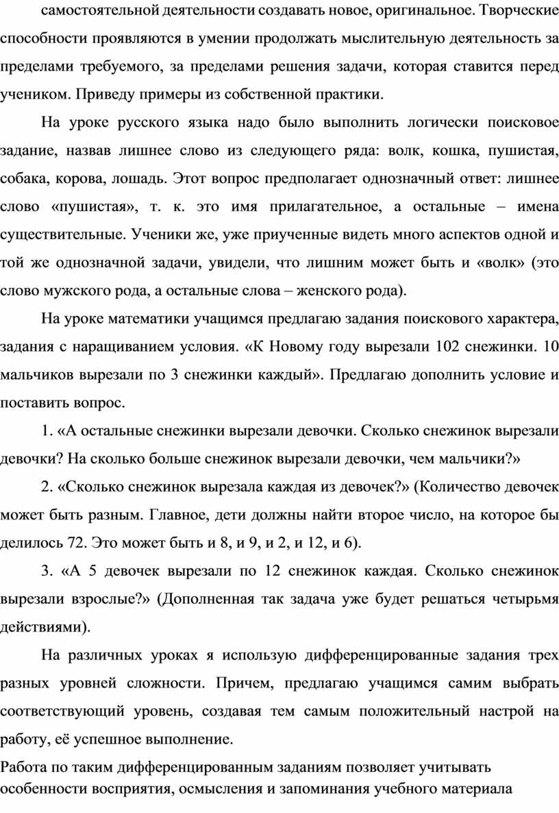 При планировании уроков я предусматриваю развитие продуктивного мышления и навыков его практического применения, большое внимание уделяю возможности детям постоянно приобщаться к новому, непрерывно развивающемуся потоку информации. На уроках дети обучаются рациональным приемам применения знания на практике, переносу своих знаний и умений, как в аналогичные, так и в измененные условия. На творческом уровне развития способностей ученик способен при помощи самостоятельной деятельности создавать новое, оригинальное. Творческие способности проявляются в умении продолжать мыслительную деятельность за пределами требуемого, за пределами решения задачи, которая ставится перед учеником. Приведу примеры из собственной практики.