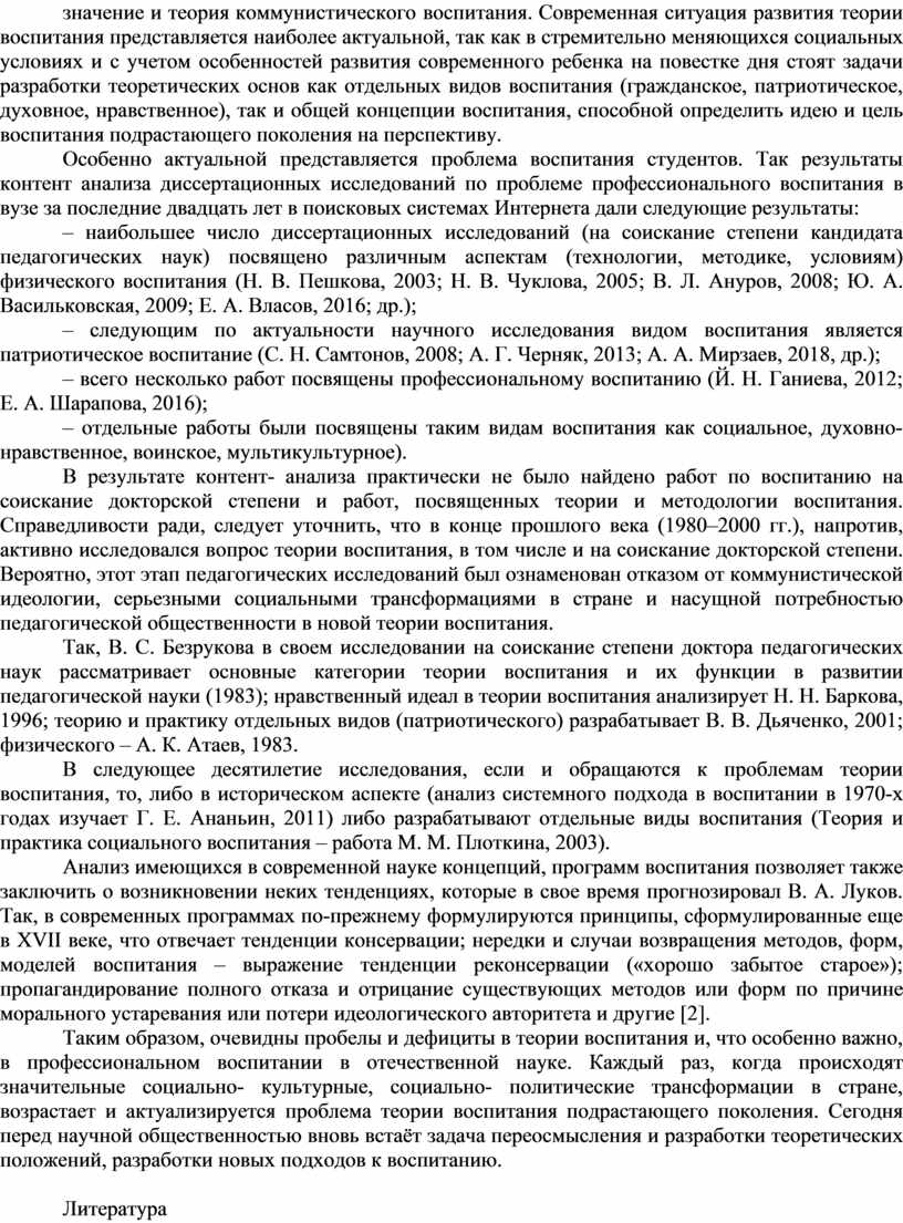 В результате контент- анализа практически не было найдено работ по воспитанию на соискание докторской степени и работ, посвященных теории и методологии воспитания. Справедливости ради, следует уточнить, что в конце прошлого века (1980–2000 гг.), напротив, активно исследовался вопрос теории воспитания, в том числе и на соискание докторской степени. Вероятно, этот этап педагогических исследований был ознаменован отказом от коммунистической идеологии, серьезными социальными трансформациями в стране и насущной потребностью педагогической общественности в новой теории воспитания.