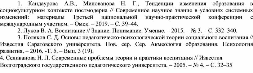 1. Кандаурова А.В., Милованова Н. Г., Тенденции изменения образования в социокультурном контексте постмодерна // Современное научное знание в условиях системных изменений: материалы Третьей национальной научно-практической конференции с международным участием. – Омск. – 2019. – С. 39–44.