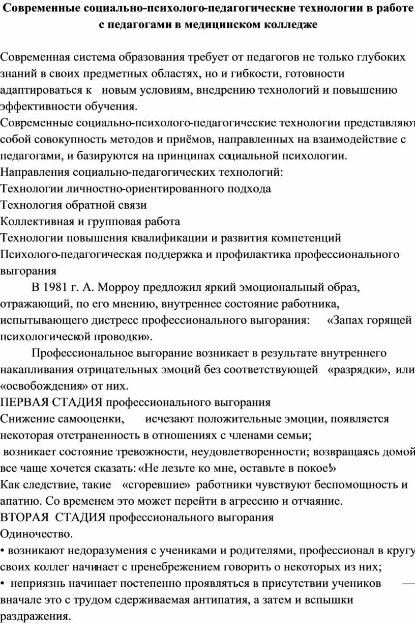 Современные социально-психолого-педагогические технологии в работе с педагогами в медицинском колледже