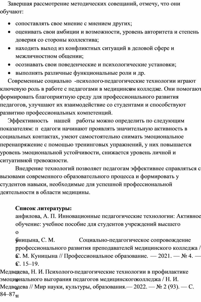 3. Медведева, Н. И. Психолого-педагогические технологии в профилактике эмоционального выгорания педагогов медицинского колледжа / Н. И. Медведева // Мир науки, культуры, образования. — 2022. — № 2 (93). — С. 84–87.