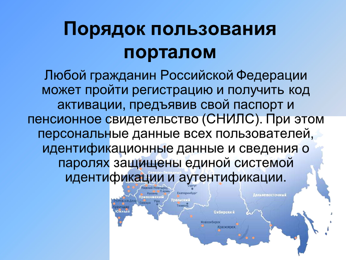 Любой гражданин Российской Федерации может пройти регистрацию и получить код активации, предъявив свой паспорт и пенсионное свидетельство (СНИЛС). При этом персональные данные всех пользователей, идентификационные данные и сведения о паролях защищены единой системой идентификации и аутентификации.