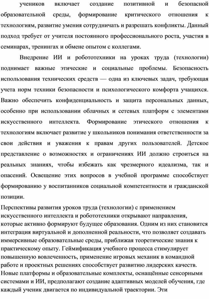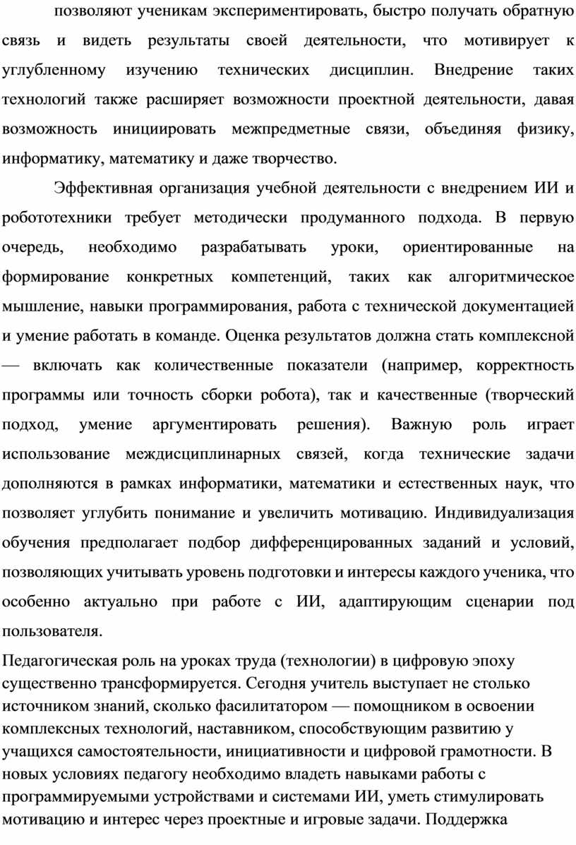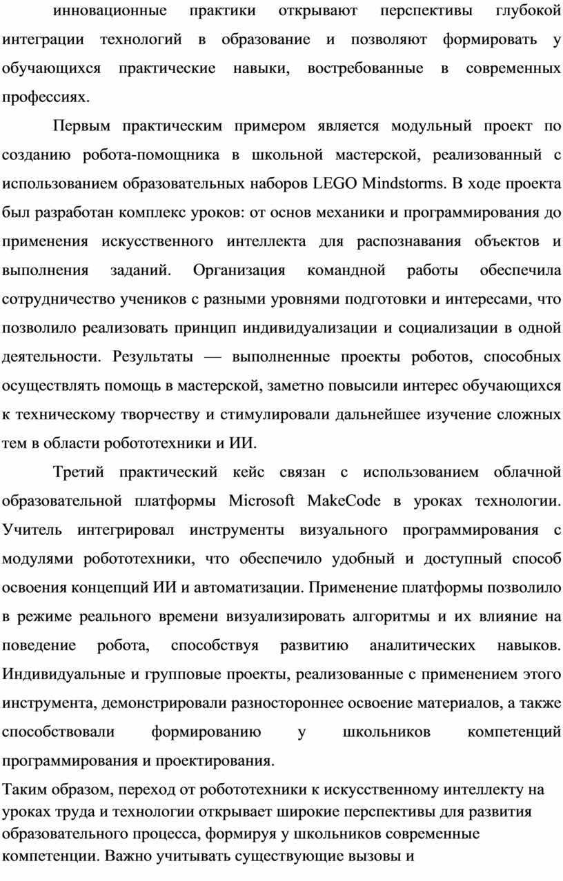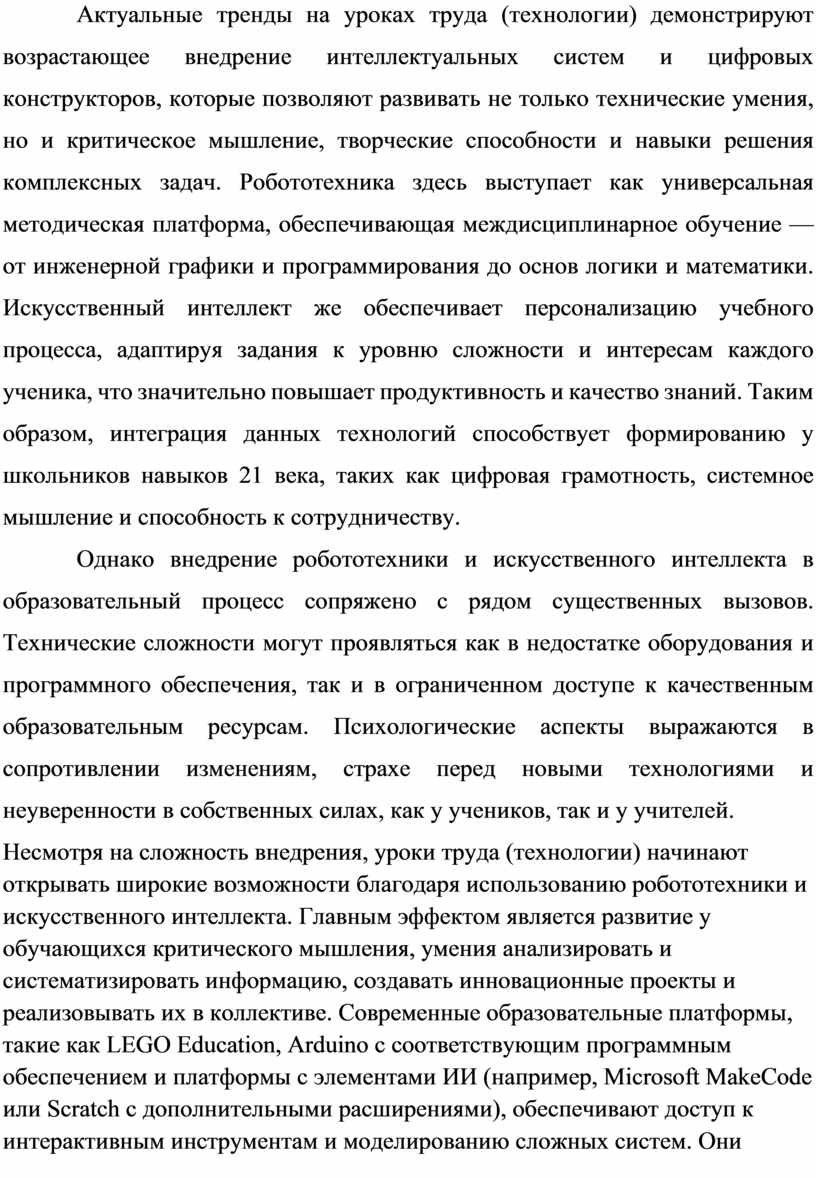 Таким образом, переход от робототехники к искусственному интеллекту на уроках труда и технологии открывает широкие перспективы для развития образовательного процесса, формируя у школьников современные компетенции. Важно учитывать существующие вызовы и системно работать над их преодолением, используя методические подходы и инновационные практики, а также развивать профессиональные компетенции педагогов. Только такой комплексный подход обеспечит эффективную интеграцию новых технологий в учебный процесс, способствуя формированию всесторонне развитой личности и специалиста будущего.
