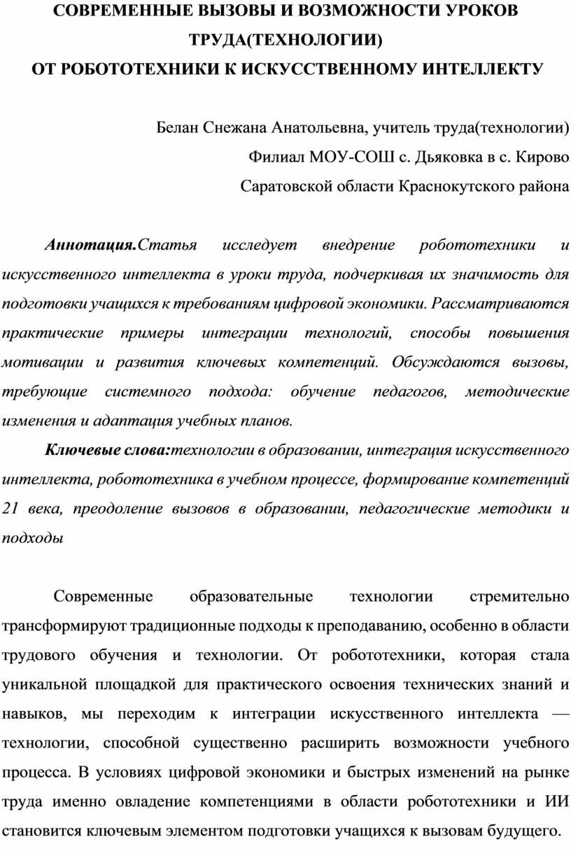 Ключевые слова:технологии в образовании, интеграция искусственного интеллекта, робототехника в учебном процессе, формирование компетенций 21 века, преодоление вызовов в образовании, педагогические методики и подходы