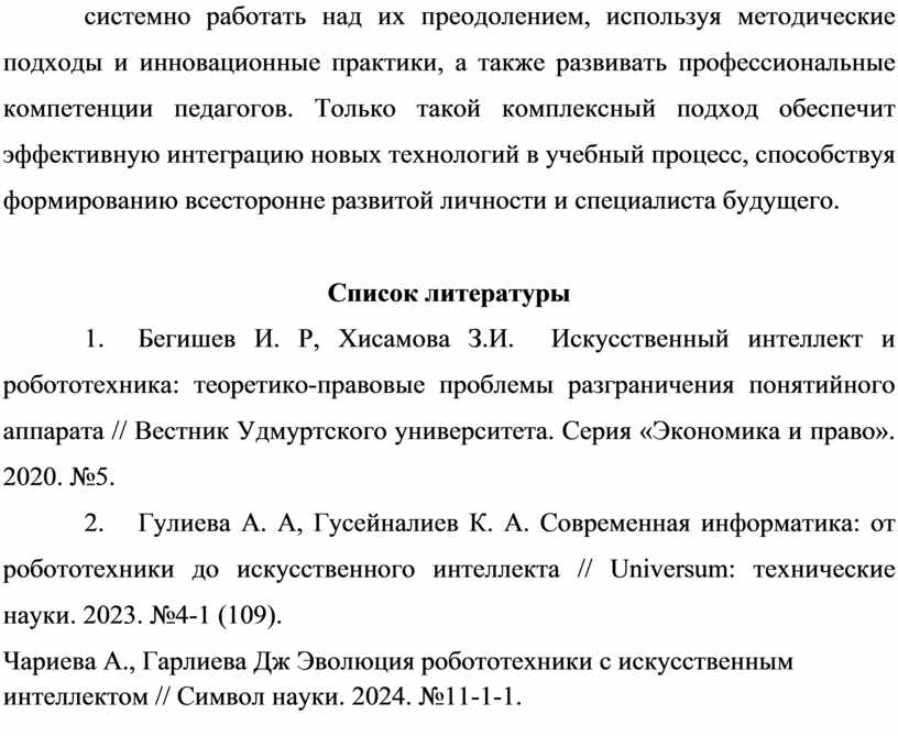 2. Гулиева А. А, Гусейналиев К. А. Современная информатика: от робототехники до искусственного интеллекта // Universum: технические науки. 2023. №4-1 (109).