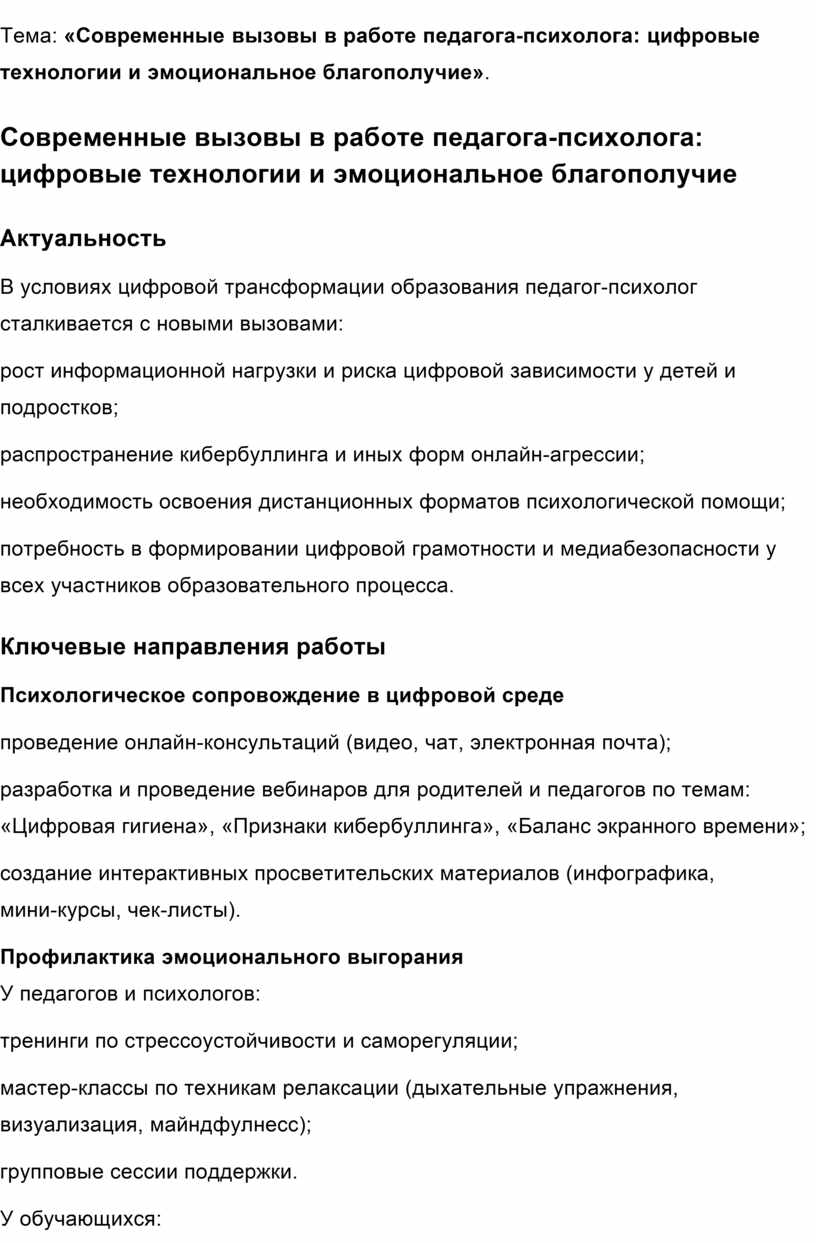 Тема: «Современные вызовы в работе педагога‑психолога: цифровые технологии и эмоциональное благополучие».