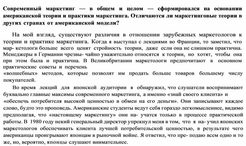 Современный маркетинг — в общем и целом — сформировался на основании американской теории и практики маркетинга. Отличаются ли маркетинговые теории в других странах от американской модели?
