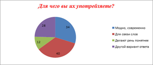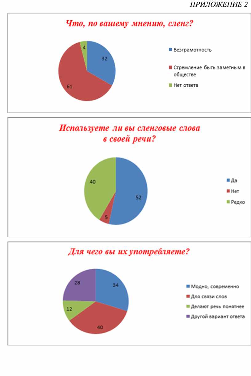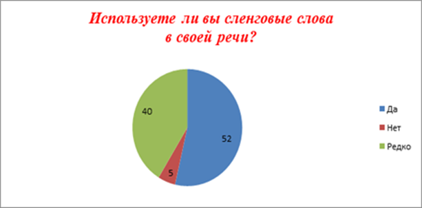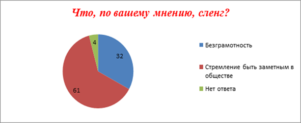 В опросе принимало участие 93 учащихся. Из анкетирования можно сделать вывод, что учащиеся употребляют сленговые слова прежде всего, чтобы быть заметными в подростковой среде, считая это модным и современным. Многие даже не задумываются о том, что можно обойтись без этих слов. Я поняла, что ребята, употребляя сленг, следуют за модой, боятся показаться смешными, если начнут разговаривать литературным языком. Кроме этого присутствует элемент самоутверждения, своеобразного протеста против окружающей действительности. На вопрос: «Могли бы вы обойтись без жаргонных слов и выражений», многие ответили, что не думали об этом. Опираясь на личные наблюдения, могу добавить, что некоторые школьники намеренно используют в своей речи сленг, не желая следовать правилам, придуманным взрослыми, другие стремятся к разнообразию, считая, что правильно говорить – это скучно.