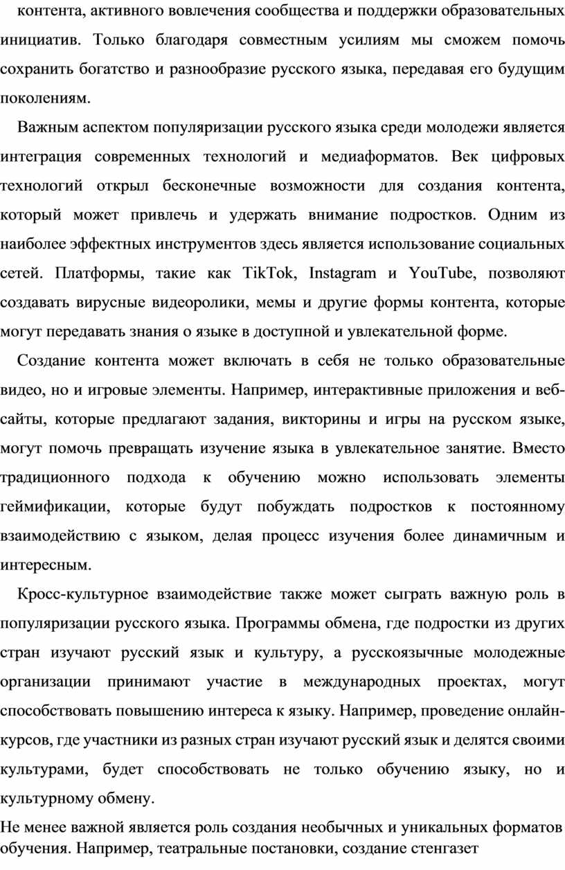 Таким образом, интеграция русского языка в различные сферы жизни молодежи через современные медиа, кросс-культурные программы и творческие инициативы может существенно повысить интерес к его изучению и использованию. Важно помнить, что поддержка инициатив, направленных на популяризацию языка, должна быть последовательной и системной, чтобы обеспечить устойчивый рост интереса к русскому языку среди будущих поколений и сохранить его богатство для будущих времён.