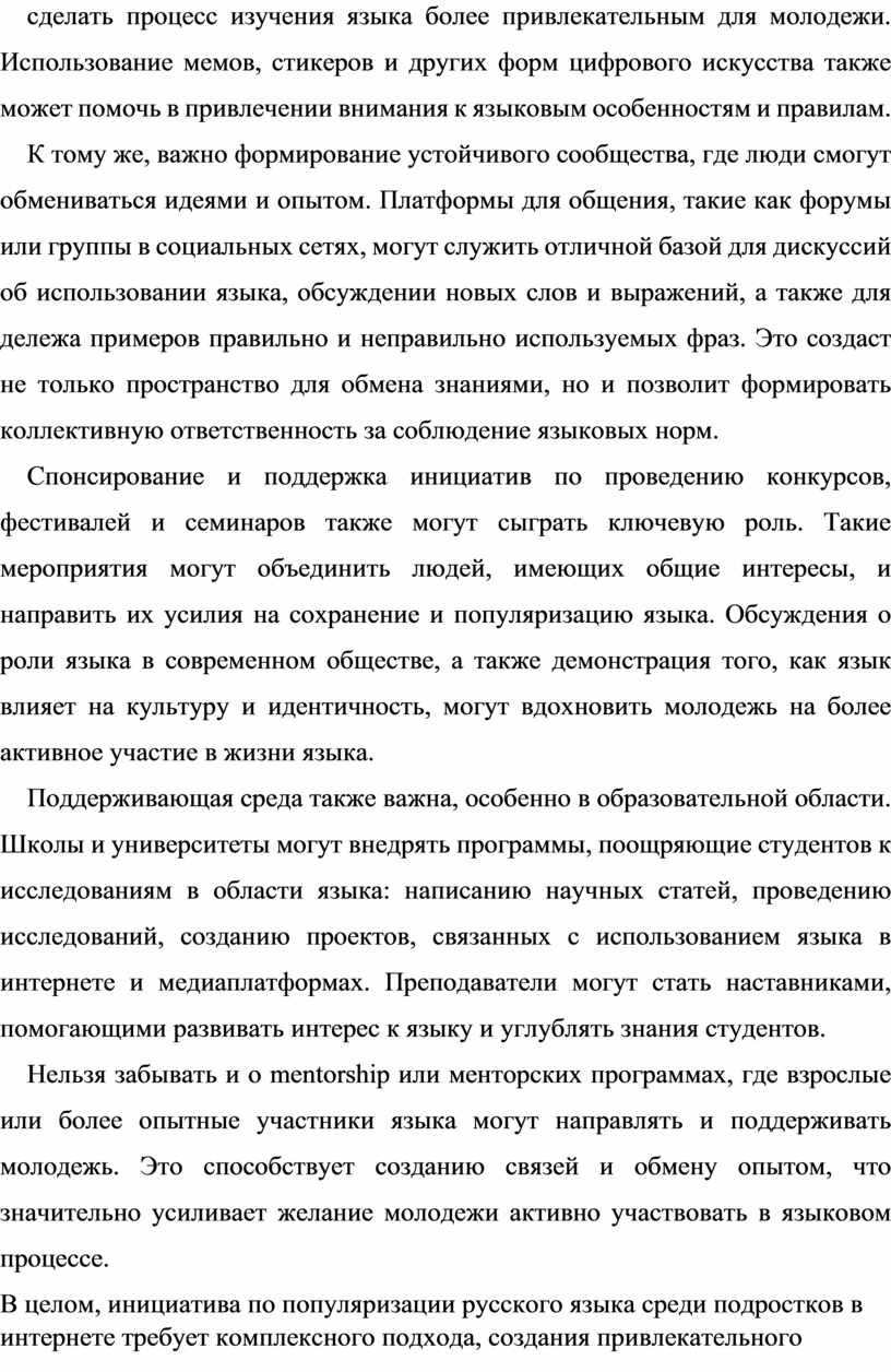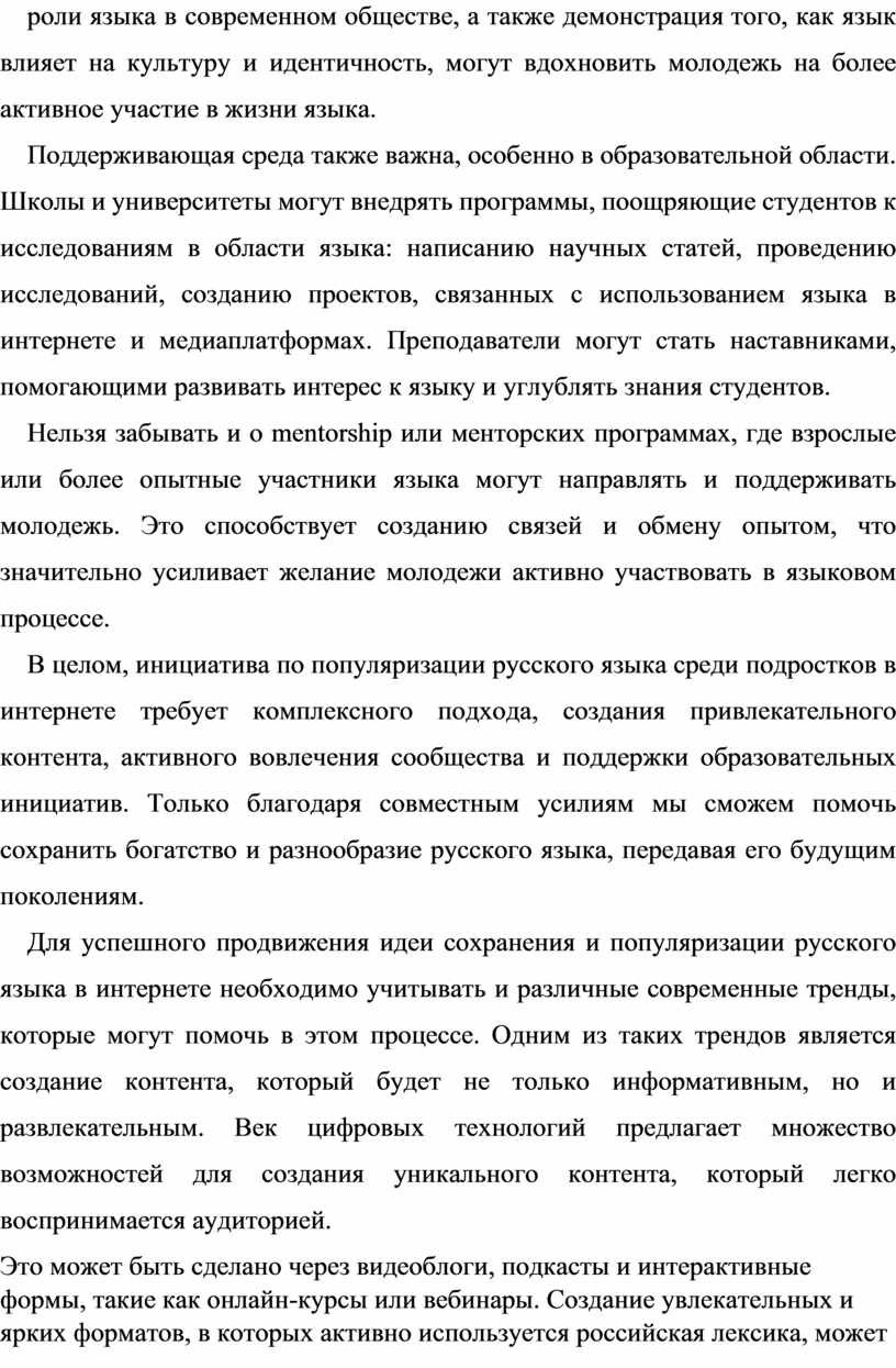 В целом, инициатива по популяризации русского языка среди подростков в интернете требует комплексного подхода, создания привлекательного контента, активного вовлечения сообщества и поддержки образовательных инициатив. Только благодаря совместным усилиям мы сможем помочь сохранить богатство и разнообразие русского языка, передавая его будущим поколениям.