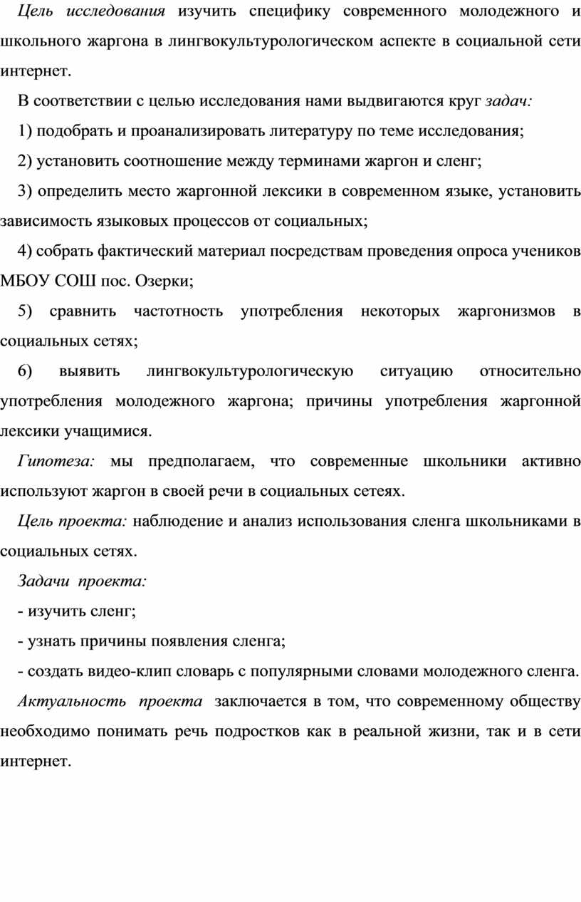 Цель исследования изучить специфику современного молодежного и школьного жаргона в лингвокультурологическом аспекте в социальной сети интернет.