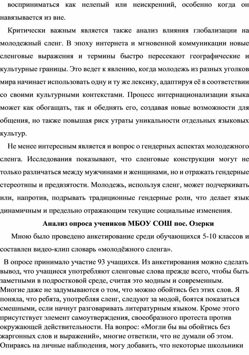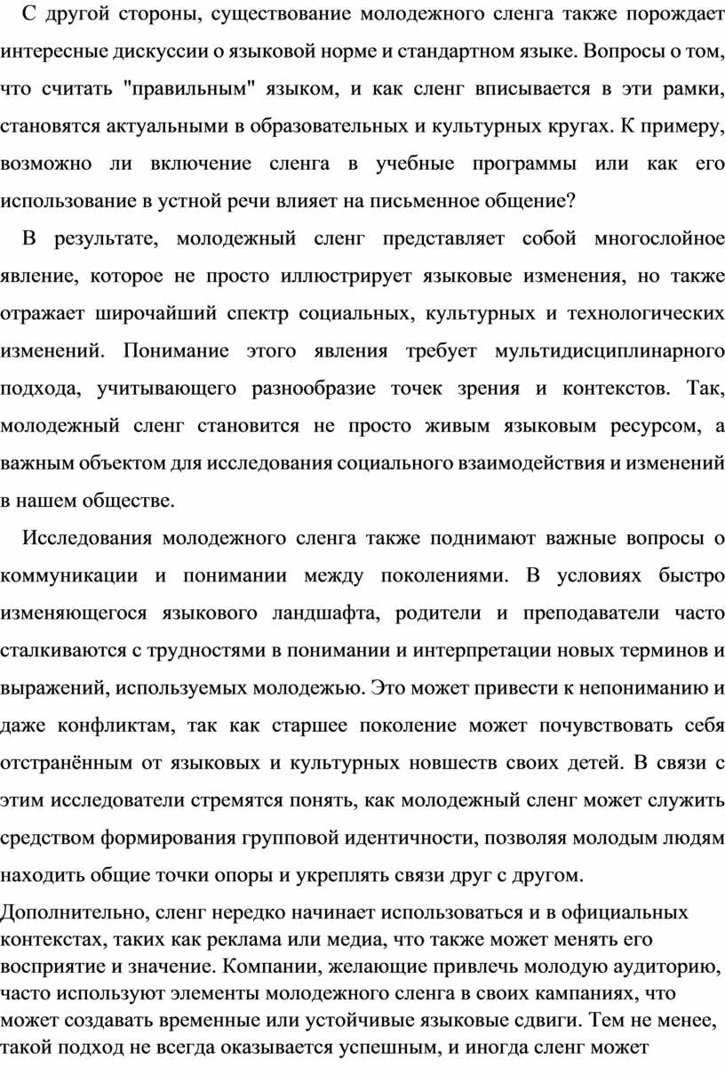 В результате, молодежный сленг представляет собой многослойное явление, которое не просто иллюстрирует языковые изменения, но также отражает широчайший спектр социальных, культурных и технологических изменений. Понимание этого явления требует мультидисциплинарного подхода, учитывающего разнообразие точек зрения и контекстов. Так, молодежный сленг становится не просто живым языковым ресурсом, а важным объектом для исследования социального взаимодействия и изменений в нашем обществе.