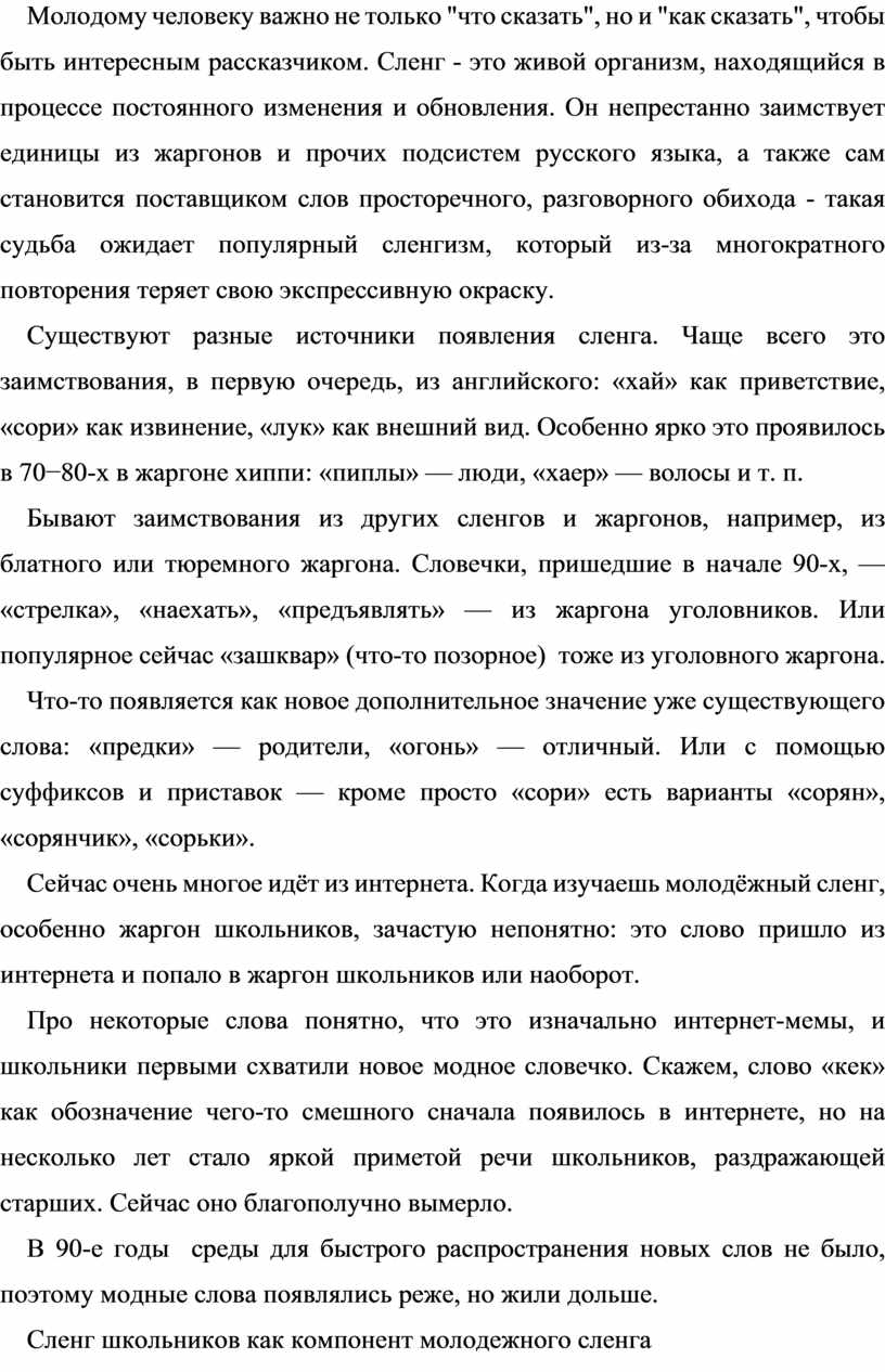2) Молодежный сленг подобен его носителям он резкий, громкий, дерзкий. Он результат своеобразного желания переиначить мир на иной манер, а также знак "я свой". Язык здесь отражает внутренние устремления молодых ярче и сильнее, чем одежда, прически, образ жизни.