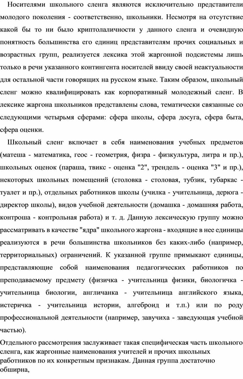 Носителями школьного сленга являются исключительно представители молодого поколения - соответственно, школьники. Несмотря на отсутствие какой бы то ни было криптолаличности у данного сленга и очевидную понятность большинства его единиц представителям прочих социальных и возрастных групп, реализуется лексика этой жаргонной подсистемы лишь только в речи указанного контингента носителей ввиду своей неактуальности для остальной части говорящих на русском языке. Таким образом, школьный сленг можно квалифицировать как корпоративный молодежный сленг. В лексике жаргона школьников представлены слова, тематически связанные со следующими четырьмя сферами: сфера школы, сфера досуга, сфера быта, сфера оценки.
