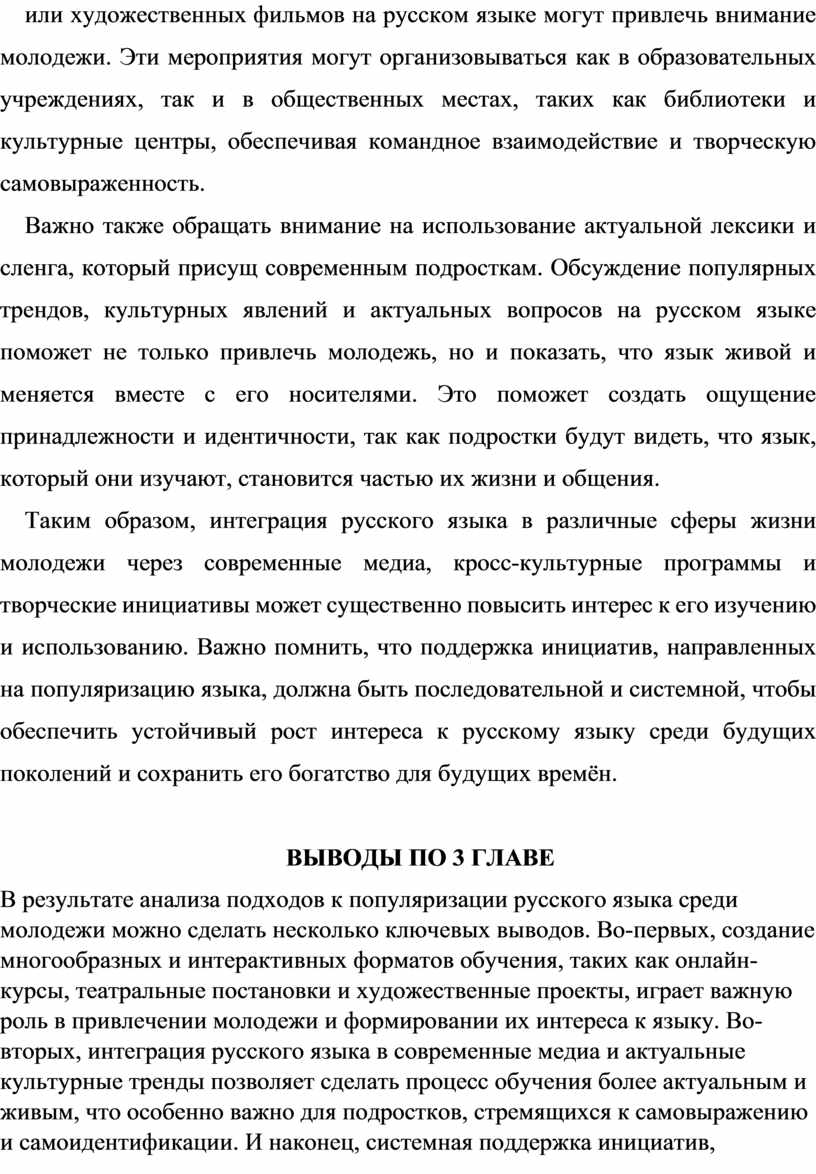 В результате анализа подходов к популяризации русского языка среди молодежи можно сделать несколько ключевых выводов. Во-первых, создание многообразных и интерактивных форматов обучения, таких как онлайн-курсы, театральные постановки и художественные проекты, играет важную роль в привлечении молодежи и формировании их интереса к языку. Во-вторых, интеграция русского языка в современные медиа и актуальные культурные тренды позволяет сделать процесс обучения более актуальным и живым, что особенно важно для подростков, стремящихся к самовыражению и самоидентификации. И наконец, системная поддержка инициатив, направленных на популяризацию языка, создаёт основу для устойчивого роста заинтересованности в его изучении. Таким образом, комплексный подход, включающий кросс-культурные программы, творческие инициативы и активное использование медиаплатформ, может значительно повысить привлекательность русского языка для молодого поколения, обеспечивая его сохранение и развитие в будущем.