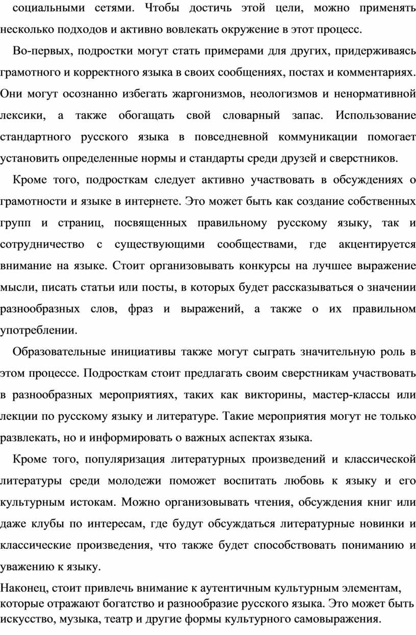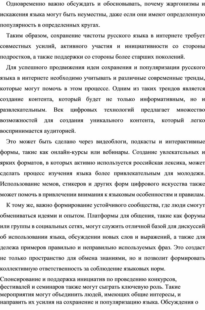 Таким образом, сохранение чистоты русского языка в интернете требует совместных усилий, активного участия и инициативности со стороны подростков, а также поддержки со стороны более старших поколений.