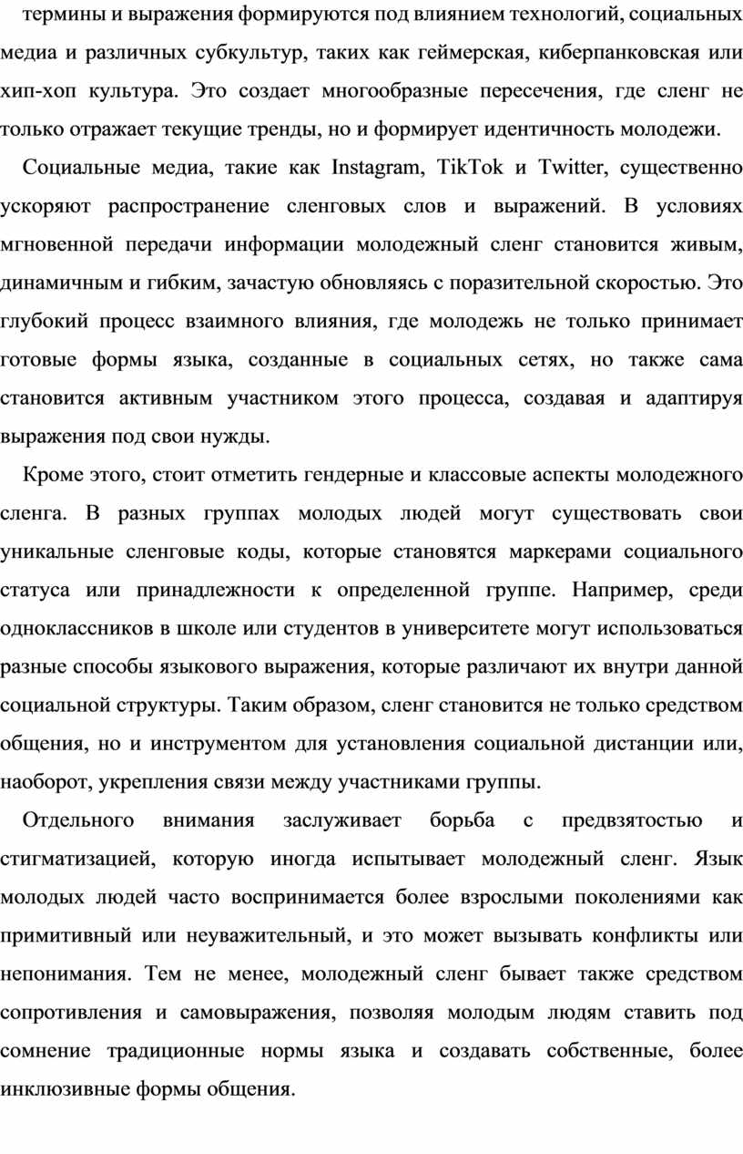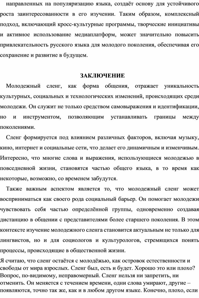 Молодежный сленг, как форма общения, отражает уникальность культурных, социальных и технологических изменений, происходящих среди молодежи. Он служит не только средством самовыражения и идентификации, но и инструментом, позволяющим устанавливать границы между поколениями.