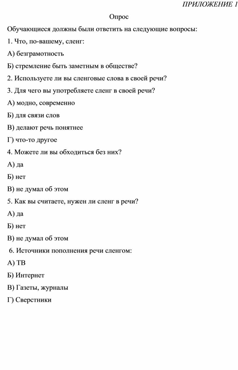 6) выявить лингвокультурологическую ситуацию относительно употребления молодежного жаргона; причины употребления жаргонной лексики учащимися.