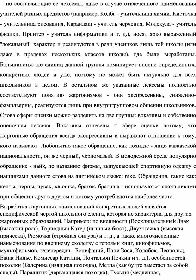 Отдельного рассмотрения заслуживает такая специфическая часть школьного сленга, как жаргонные наименования учителей и прочих школьных работников по их конкретным признакам. Данная группа достаточно обширна, но составляющие ее лексемы, даже в случае отвлеченного наименования учителей разных предметов (например, Колба - учительница химии, Кисточка - учительница рисования, Карандаш - учитель черчения, Молекула - учитель физики, Принтер - учитель информатики и т. д.), носят ярко выраженный ''локальный'' характер и реализуются в речи учеников лишь той школы (или даже в пределах нескольких классов школы), где были выработаны. Большинство же единиц данной группы номинирует вполне определенных, конкретных людей и уже, поэтому не может быть актуально для всех школьников в целом. В остальном же указанные лексемы полностью соответствуют понятию жаргонизмов - они экспрессивны, сниженно-фамильярны, реализуются лишь при внутригрупповом общении школьников. Слова сферы оценки можно разделить на две группы: вокативы и собственно оценочная лексика. Вокативы отнесены к сфере оценки потому, что жаргонные обращения всегда экспрессивны и выражают отношение к тому, кого называют. Любопытно такое обращение, как лохидзе - лицо кавказской национальности, он же черный, черномазый. В молодежной среде популярно обращение - найк, по названию фирмы, выпускающей спортивную одежду с нашивками данного слова на английском языке: nike. Обращения, такие как: кенты, перцы, чувак, клюшка, браток, братиша - используются школьниками при общении друг с другом и потому употребляются наиболее часто.