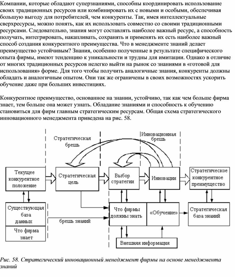 Конкурентное преимущество, основанное на знании, устойчиво, так как чем больше фирма знает, тем больше она может узнать. Обладание знаниями и способность к обучению становиться для фирм главным стратегическим ресурсам. Общая схема стратегического инновационного менеджмента приведена на рис. 58.